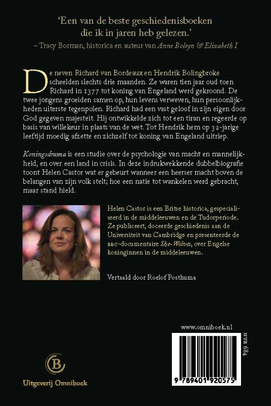 ‘Koningsdrama’ van Helen Castor is een studie over de psychologie van macht en mannelijkheid, en over een land in crisis. De neven Richard van Bordeaux en Hendrik Bolingbroke scheelden slechts drie maanden. Ze waren tien jaar oud toen Richard in 1377 tot koning van Engeland werd gekroond. De twee jongens groeiden samen op, hun levens verweven, hun persoonlijkheden uiterste tegenpolen. Richard had een vast geloof in zijn eigen door God gegeven majesteit. Hij ontwikkelde zich tot een tiran en regeerde op basis van willekeur in plaats van de wet. Tot Hendrik hem op 32-jarige leeftijd moedig afzette en zichzelf tot koning van Engeland uitriep.
