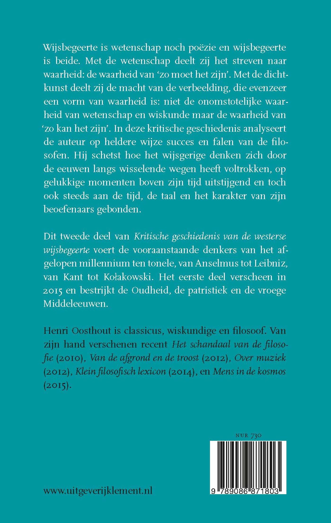 Wijsbegeerte is wetenschap noch poëzie en wijsbegeerte is beide. Met de wetenschap deelt zij het streven naar waarheid: de waarheid van 'zo moet het zijn'. Met de dichtkunst deelt zij de macht van de verbeelding, die ook een vorm van waarheid is: niet de onomstotelijke waarheid van wetenschap en wiskunde maar de waarheid van 'zo kan het zijn'. In dit tweede deel van zijn 'Kritische geschiedenis van de westerse wijsbegeerte' voert Henri Oosthout vanzelfsprekend de vooraanstaande filosofen van het afgelopen millennium ten tonele, van Aquino tot Leibniz, van Kant tot Kolakowski. Een geschiedenis van de filosofie zou echter onvolledig zijn wanneer fysici en dichters daarin ontbraken.
