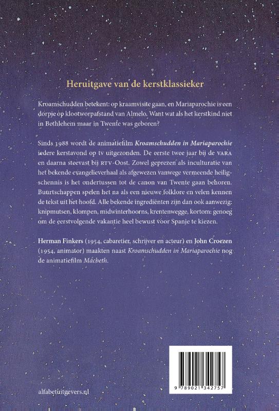 Dit bijzondere kerstverhaal speelt zich niet af in Bethlehem, maar in het Twentse Mariaparochie, een dorp op steenworp afstand van Almelo. Bij spiekerJozef en zijn vrouw Marie wordt een kindeke geboren en ze ontvangen een keur aan gasten die allen op zijn Twents komen ‘kroamschudd’n’. Herders en drie wijzen uit het oosten komen de kleine ‘potboon’ welkom heten en naar goed Twents gebruik wordt een krentenwegge aangeboden. John Croezen maakt de tekeningen bij dit vrolijke kerstverhaal van Herman Finkers.