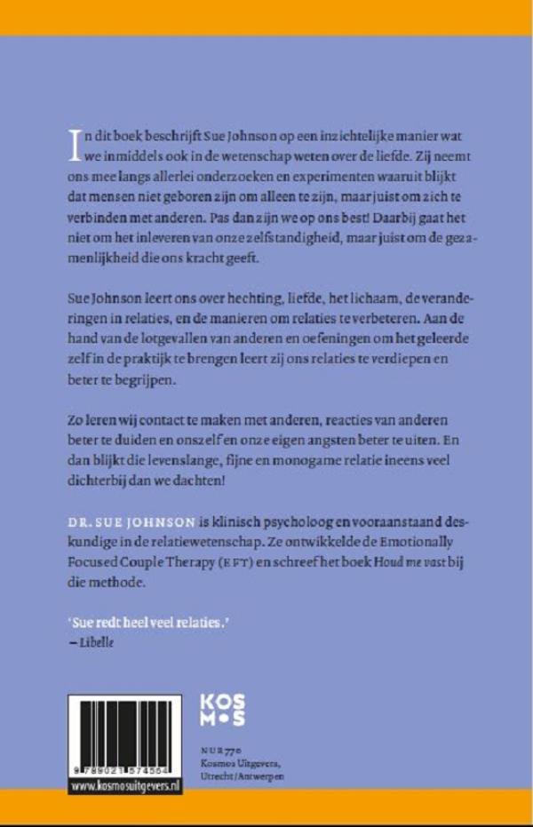 Dr. Sue Johnson schreef eerder de bestseller Houd me vast. Met dit boek redde zij wereldwijd duizenden relaties. 70% van de mensen die haar EFT-therapie (Emotionally Focused Couple Therapy) volgen blijft bij elkaar, de overige 30% gaat zeer weloverwogen uit elkaar.