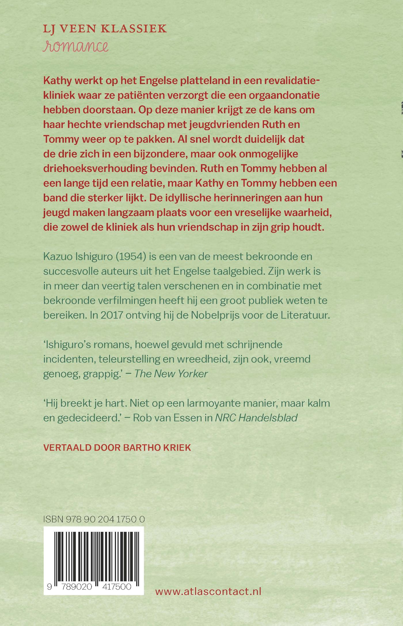 ‘Laat me nooit alleen’ van Nobelprijswinnaar Kazuo Ishiguro speelt in Engeland, eind twintigste eeuw. Kathy is eenendertig en werkt op het platteland in een revalidatiekliniek. Ze heeft haar vriendschap met Ruth na jaren weer op kunnen pakken toen ze haar verzorger werd na een orgaandonatie. Ook haar oude jeugdliefde Tommy komt terug in haar leven. Gaandeweg wordt duidelijk dat de vrienden door hun gemeenschappelijke lot en afkomst een bijzondere band hebben – en dat achter hun idyllische jeugd een donkere werkelijkheid schuilgaat.