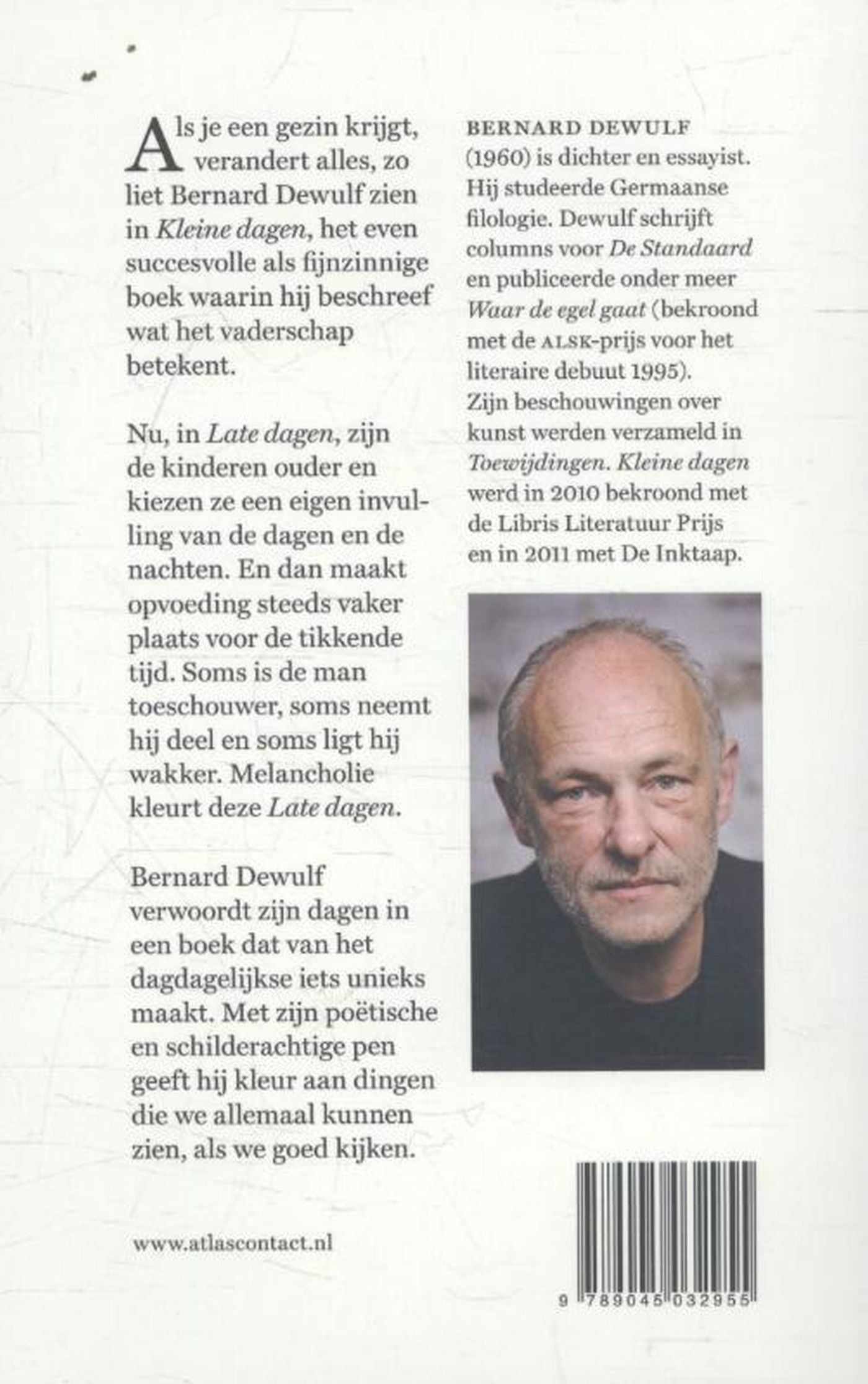 Als je een gezin krijgt, verandert alles, zo liet Bernard Dewulf zien in Kleine dagen, het even succesvolle als fijnzinnige boek waarin hij beschreef wat het vaderschap betekent. Nu, in Late dagen, zijn de kinderen ouder en kiezen ze een eigen invulling van de dagen en de nachten. En dan maakt verwondering steeds vaker plaats voor de opvoeding. Soms is de vader toeschouwer en soms ligt hij wakker. Soms is het zomer, altijd weer wordt het herfst. Melancholie kleurt deze Late dagen.