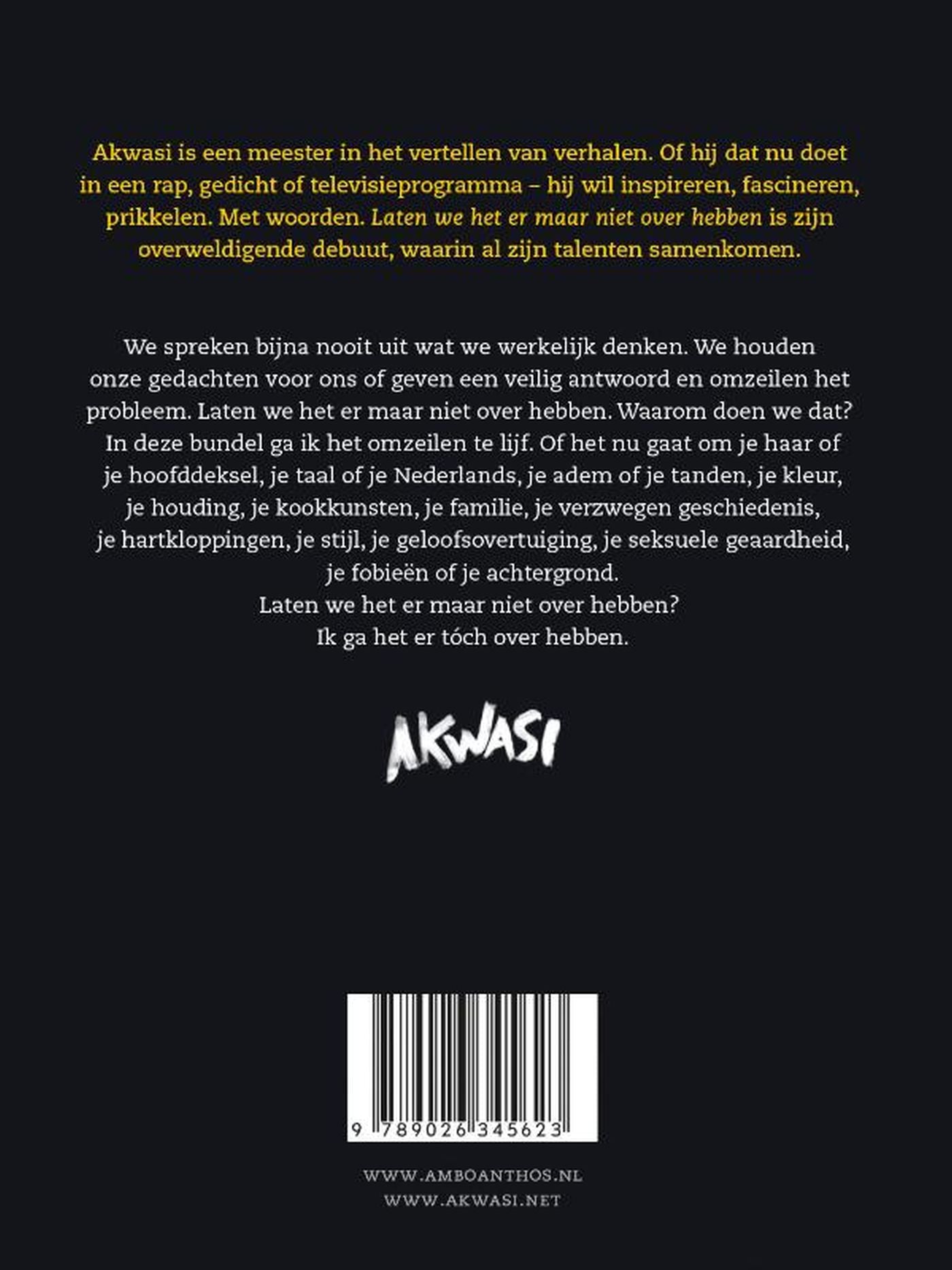 Laten we het er maar niet over hebben van Akwasi, bekend van de band Zwart Licht en optredens in De Wereld Draait Door, is een bundel met de impact van een vuistslag. Laten we het er maar niet over hebben gaat vooral over ongemak in communicatie. We spreken bijna nooit uit wat we werkelijk denken. We houden onze gedachten voor ons of geven een veilig antwoord en omzeilen het probleem. Laten we het maar niet over hebben. Waarom doen we dat?