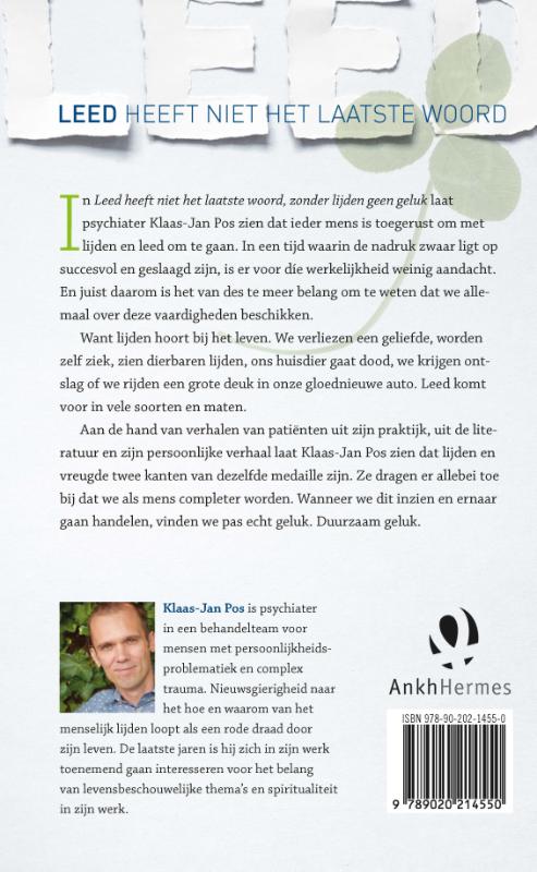 In 'Leed heeft niet het laatste woord, zonder lijden geen geluk' laat psychiater Klaas-Jan Pos zien dat ieder mens is toegerust om met lijden en leed om te gaan. In een tijd waarin de nadruk zwaar ligt op succesvol en geslaagd zijn, is er voor die werkelijkheid weinig aandacht. En juist daarom van des te meer belang om te weten dat we allemaal over deze vaardigheden beschikken.