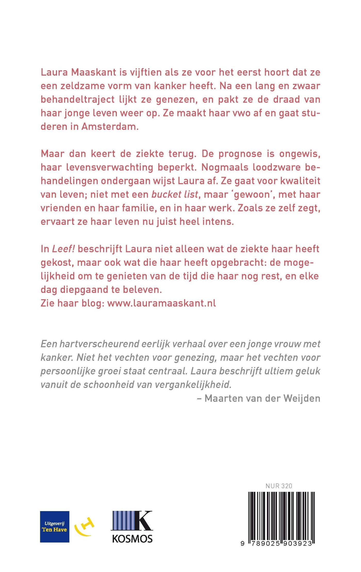 In mei 2014 verscheen ‘Leef!’, het debuut van Laura Maaskant. Hierin vertelt zij hoe haar leven is veranderd na de diagnose ‘kanker’. Die diagnose kreeg ze op haar vijftiende, en vier jaar later opnieuw. Hoe leeft zij met een ongeneeslijke ziekte? Laura kiest voor kwaliteit van leven en probeert elke dag intens te beleven.