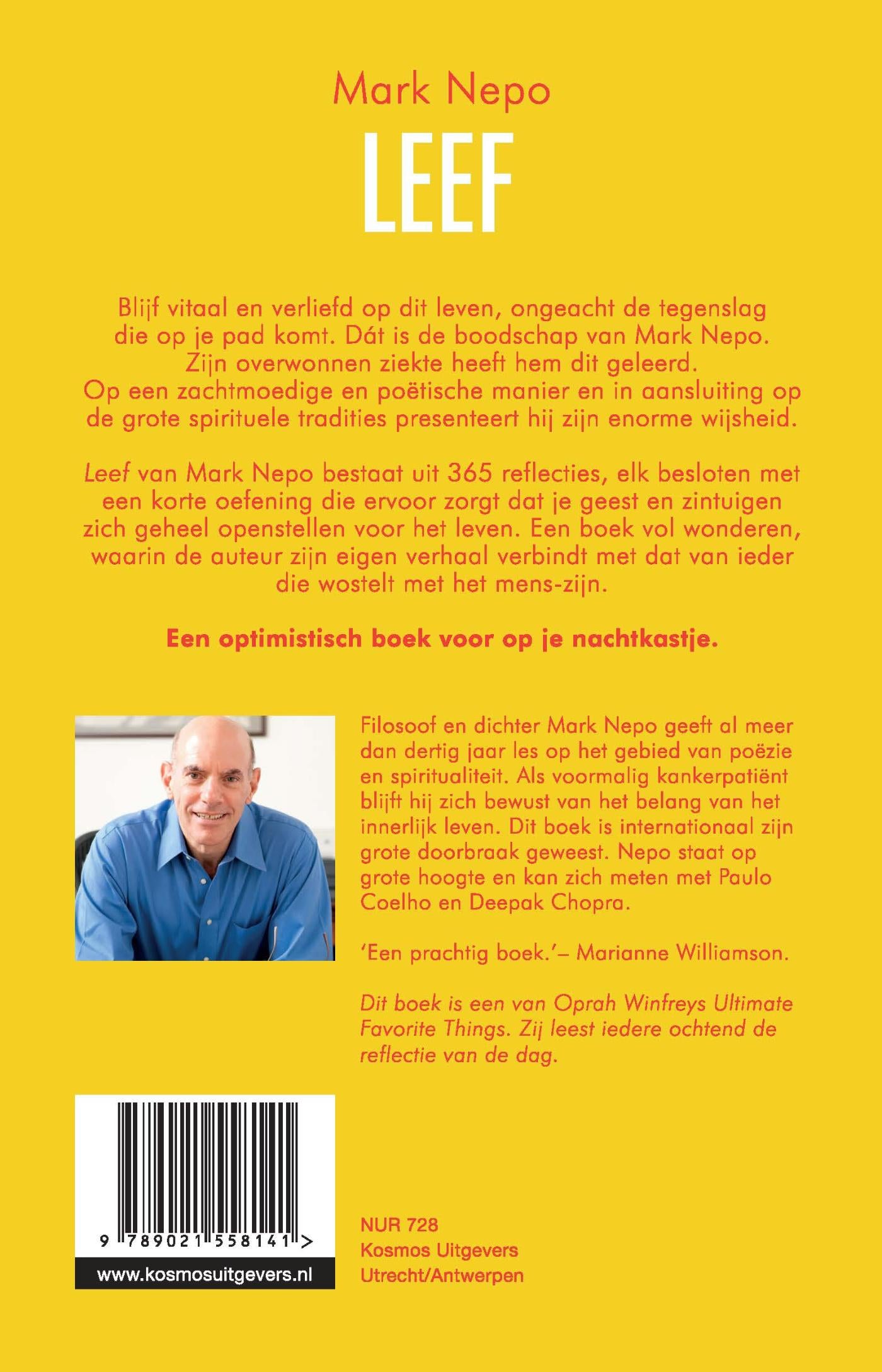 Blijf vitaal en verliefd op dit leven, ongeacht de tegenslag die op je pad komt. Dat is wat dichter, filosoof en schrijver Mark Nepo je leert in zijn boek Leef. Nepo doet dit met 365 reflecties (één voor elke dag), die worden besloten met een korte oefening, zodat je geest en zintuigen zich geheel openstellen voor een mindful leven. Leef is een boek vol wonderen, waarin het verhaal van Mark Nepo niet alleen vervlochten is met dat van anderen die worstelen met hun mens-zijn, maar ook met de grote wijsheidstradities.