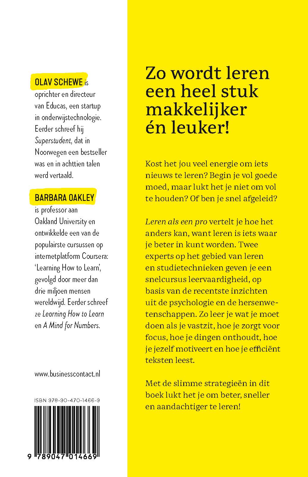 In ‘Leren als een pro’ vertellen Olav Schewe en Barbara Oakley hoe je beter kunt worden in leren. Want kost het jou veel energie om iets nieuws te leren? Begin je vaak vol goede moed, maar lukt het je niet om vol te houden? Of ben je snel afgeleid? ‘Leren als een pro’ vertelt je hoe het anders kan.