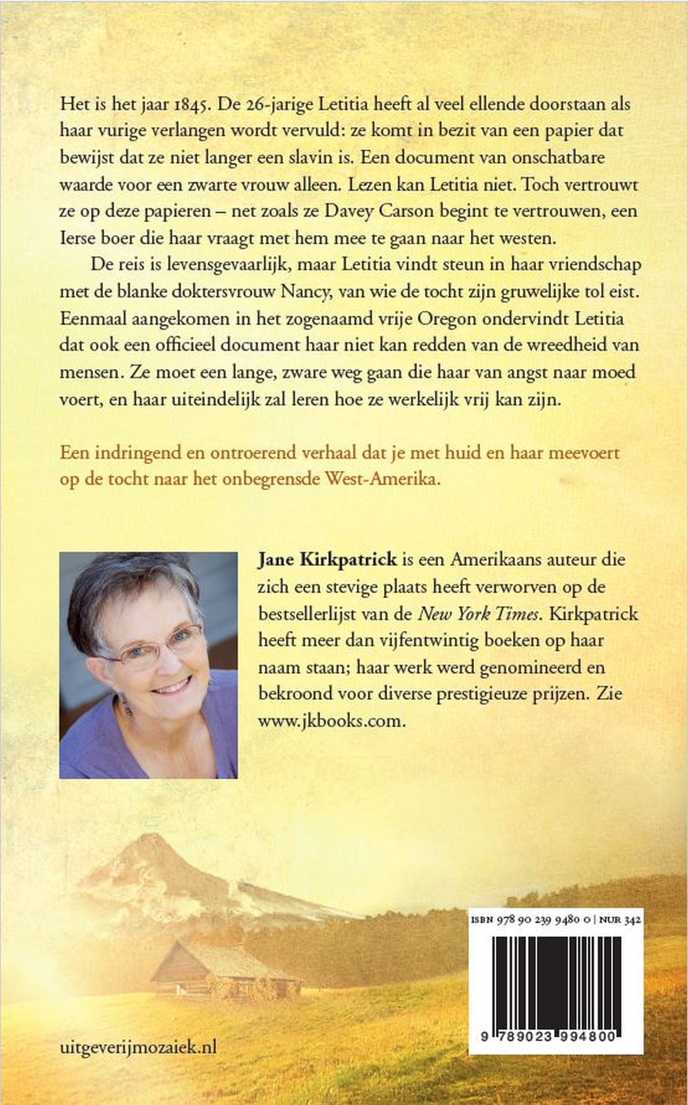 Het is het jaar 1845. De 26-jarige Letitia heeft al veel ellende doorstaan als haar vurige verlangen wordt vervuld: ze komt in bezit van een papier dat bewijst dat ze niet langer een slavin is. Een document van onschatbare waarde voor een zwarte vrouw alleen. Lezen kan Letitia niet. Toch vertrouwt ze op deze papieren – net zoals ze Davey Carson begint te vertrouwen, een Ierse boer die haar vraagt met hem mee te gaan naar het westen.