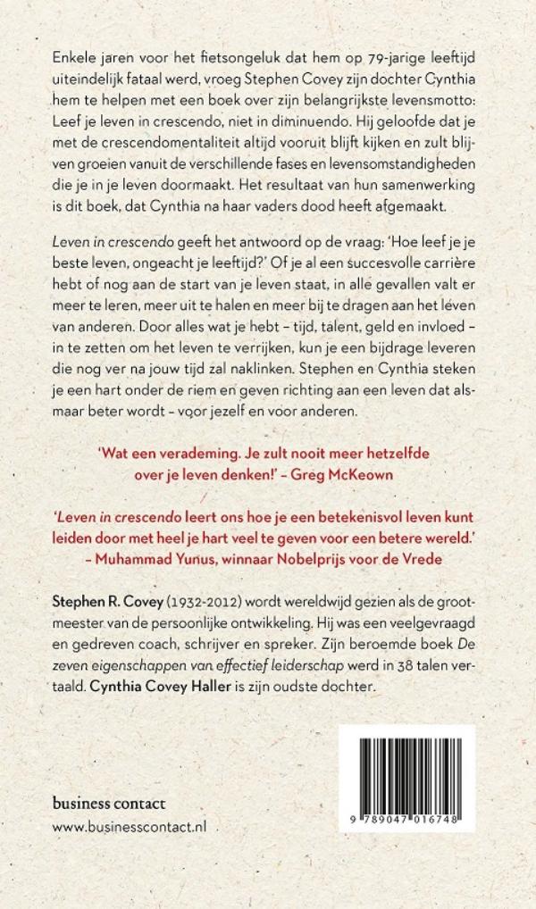 Enkele jaren voor zijn dood vroeg Stephen Covey zijn dochter Cynthia hem te helpen met een boek over zijn belangrijkste levensmotto: Leef je leven in crescendo, niet in diminuendo. Hij geloofde dat je met de crescendo-mentaliteit altijd vooruit blijft kijken en zult blijven groeien vanuit de verschillende fases en levensomstandigheden die je in je leven doormaakt. Het resultaat van hun samenwerking is dit boek, dat Cynthia na haar vaders dood heeft afgemaakt.