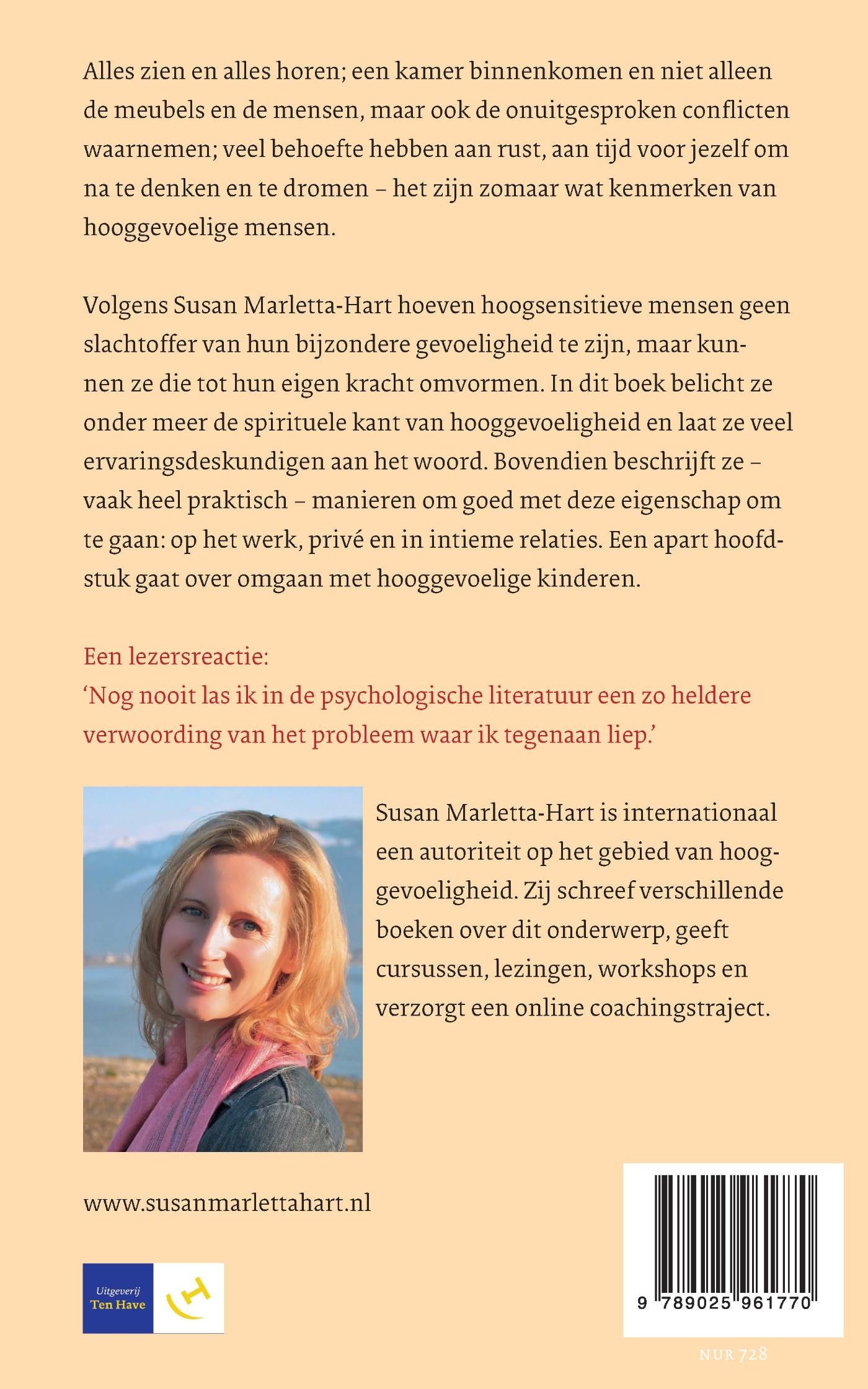 Susan Marlette Hart bespreekt hoe we kunnen leven met hooggevoeligheid. Hoogsensitieve mensen hoeven volgens Susan Marletta Hart geen slachtoffer van hun gevoeligheid te zijn, maar kunnen die tot hun kracht omvormen. In haar klassieke boek over hsp’ers belicht ze onder meer de spirituele kant van hooggevoeligheid. Ook komen veel ervaringsdeskundigen aan het woord. Ten slotte krijgt de lezer praktische adviezen hoe om te gaan met deze eigenschap, op het werk, privé en in relaties.