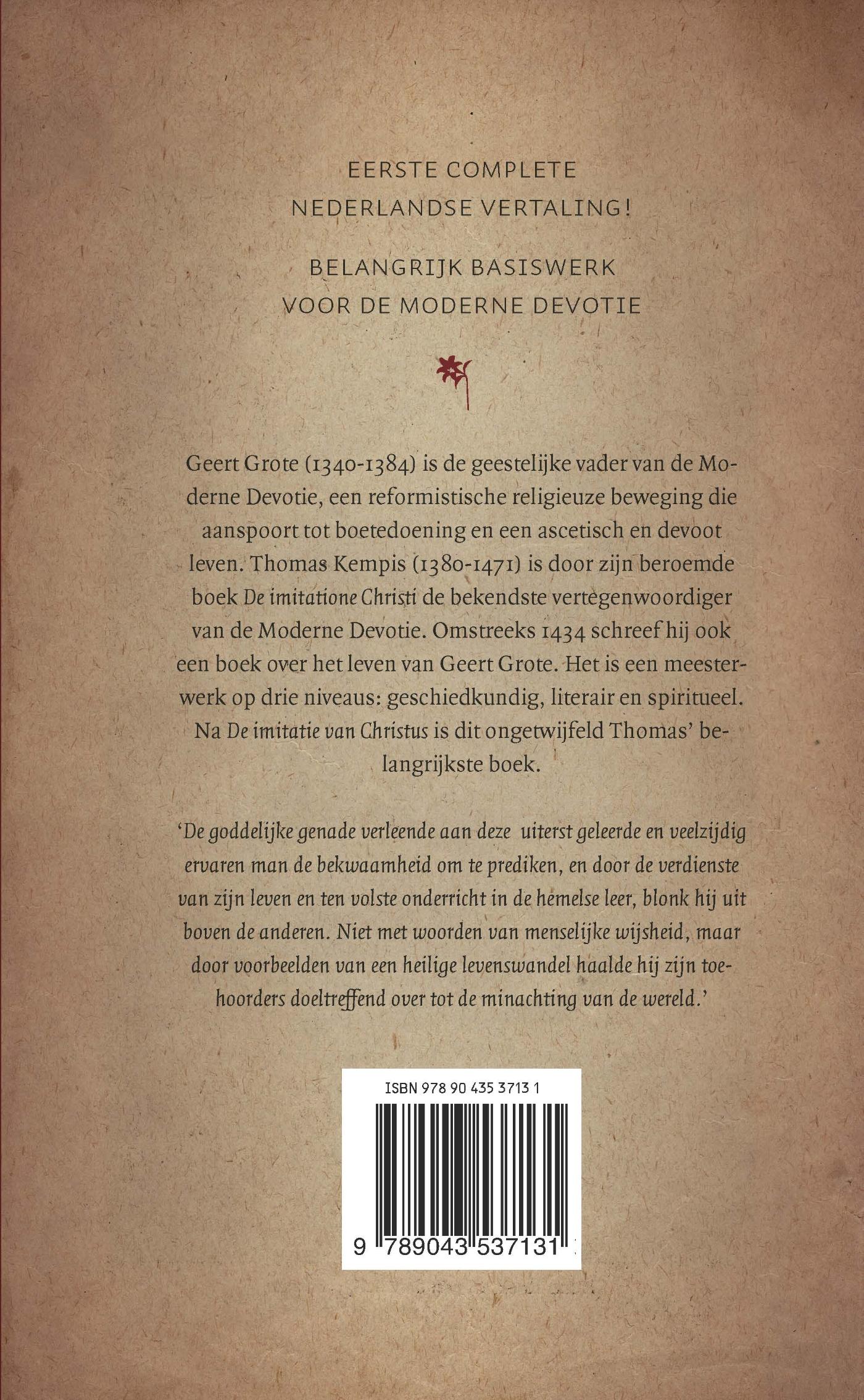 ‘Leven van Geert Grote’, geschreven door Thomas Kempis, is de biografie van Geert Grote, de grondlegger van de Moderne Devotie. Zevenhonderd jaar geleden stierven beide ouders van de toen tienjarige Geert Grote tijdens de eerste golf van de zwarte dood; 34 jaar later overleed hij aan dezelfde ziekte. Twaalf jaar voor zijn dood had hij een religieuze ervaring die zijn leven drastisch zou veranderen. Door zijn vurige geloof werd hij de grondlegger van de Moderne Devotie. Zonder hem zou de wereld nooit gehoord hebben van de Broeders en Zusters van het Gemene Leven of ‘De navolging van Christus’. Vijftig jaar na zijn dood schreef Thomas Kempis een biografie van deze markante religieuze wegbereider.