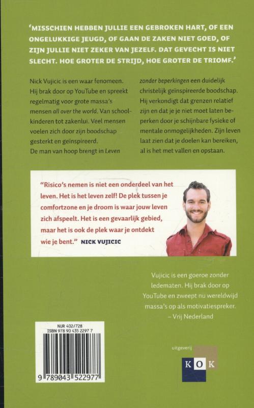 Nick Vujicic is een waar fenomeen. Hij brak door op YouTube en spreekt regelmatig voor grote massa's mensen all over the World. Van schoolkinderen tot zakenlui. Veel mensen voelen zich door zijn boodschap geïnspireerd. Nick is een man die zonder armen en benen is geboren als gevolg van een zeer zeldzaam syndroom. Sinds zijn 18e is hij begonnen voor groepen mensen te spreken. Nadat hij op zijn 24ste verhuisde van Australië naar Los Angeles nam zijn bekendheid een vlucht. De man van hoop brengt in Leven zonder beperkingen een duidelijk christelijk geïnspireerde boodschap. Hij verkondigt dat grenzen relatief zijn en dat je je niet moet laten beperken door je schijnbare fysieke of mentale onmogelijkheden. Zijn leven laat zien dat je zaken kan bereiken, al is het met vallen en opstaan.