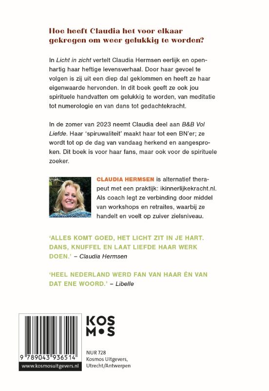 In 'Licht in zicht' vertelt Claudia Hermsen eerlijk en openhartig haar heftige levensverhaal en geeft ze je spirituele handvatten om gelukkig te worden. Door haar gevoel te volgen is zij uit een diep dal geklommen en heeft ze haar eigenwaarde hervonden. In de zomer van 2023 neemt Claudia deel aan een televisieserie die een kijkcijferhit wordt. Haar 'spiruwaliteit' maakt haar tot een BN'er; ze wordt tot op de dag van vandaag herkend en aangesproken. Dit boek is voor haar fans, maar ook voor de spirituele zoeker.