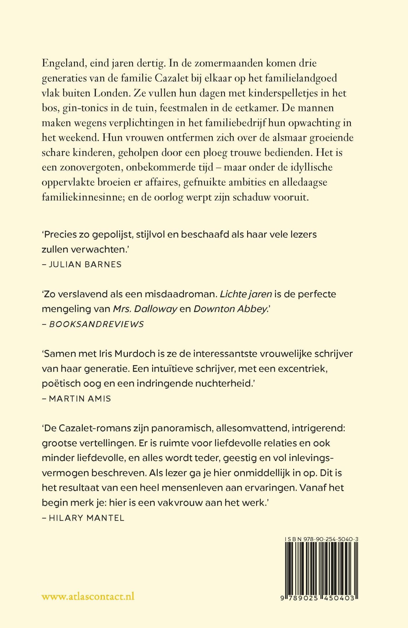 De nadagen van het victoriaanse Engeland en de eerste onzekere jaren na het einde van de oorlog vormen de achtergrond van de vijfdelige ‘Cazalet-kronieken’ van Elizabeth Jane Howard, die de periode 1937-1947omspannen. Deel 1, ‘Lichte jaren’, begint eind jaren dertig, in de laatste gouden jaren voor het uitbreken van de Tweede Wereldoorlog. In de zomermaanden komen drie generaties van de familie Cazalet bij elkaar op hun familielandgoed vlak buiten Londen. Ze vullen hun dagen met kinderspelletjes in het bos, picknicken op het strand, gin-tonics in de tuin, feestmalen in de eetkamer. Het is een zonovergoten, onbekommerde tijd – maar onder de idyllische oppervlakte broeien er affaires en gefnuikte ambities; en de oorlog werpt zijn schaduw vooruit. ‘Lichte Jaren’: voor de liefhebbers van ‘Downton Abbey’.
