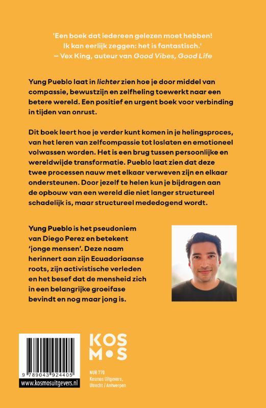 In zijn non-fictie debuut lichter laat Yung Pueblo zien hoe je verder kunt komen in je helingsproces; van het ontwikkelen van zelfcompassie tot loslaten en emotioneel volwassen worden. Naarmate de zwaarte wegvalt en je hoofd niet meer overladen is met spanning, kun je verbinden met het heden. En wanneer je jouw zelfbewustzijn vergroot, kun je positief bijdragen aan de gezondheid en harmonie van de hele mensheid. Het laatste deel slaat de brug tussen persoonlijke en wereldwijde transformatie. Yung Pueblo’s hoop is dat we zo allemaal bijdragen aan een positievere toekomst.