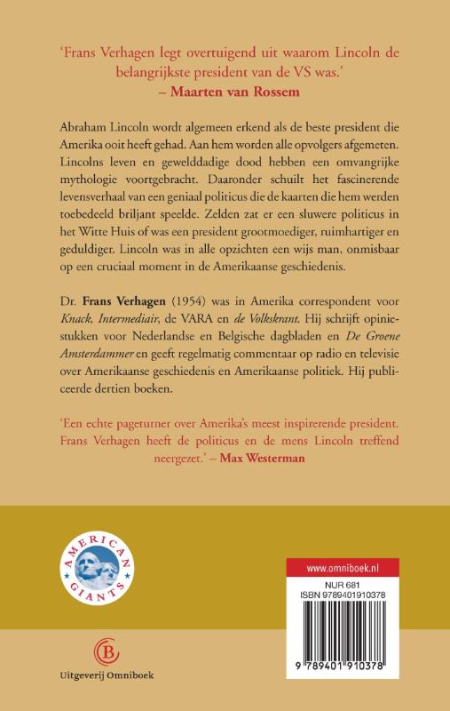 In deze biografie vertelt Amerikakakenner Frans Verhagen het fascinerende levensverhaal van Abraham Lincoln en hoe dat zijn presidentschap bepaalde. Het brengt ook zijn geniale politieke inzicht voor het voetlicht. Lincoln was een wijs man, grootmoedig en geduldig. Maar ook sluw, manipulatief, zelfs machiavellistisch. Hij was modern voor zijn tijd: Lincoln zag de macht van media in, maakte veelvuldig gebruik van het nieuwe middel van de fotografie en was een geweldig redenaar. In de Burgeroorlog bleef Lincoln koste wat kost vasthouden aan het behoud van de Unie. Hij accepteerde niet dat Amerika uiteen viel. Lincoln maakte de afschaffing van slavernij pas in een laat stadium deel van de strijd. Daardoor kon hij de eenheid van het land als prioriteit behouden. Pas toen die eenheid gegarandeerd was, voegde hij afschaffing van de slavernij toe aan de doelstellingen. Zo won het Noorden onder Lincoln niet alleen de Burgeroorlog maar hij zorgde er ook voor dat Amerika bij elkaar bleef en meer dan ooit één land werd. Een paar dagen na het einde van de Burgeroorlog werd Lincoln vermoord. Zo werd hij een martelaar voor een verenigd land, door alle Amerikanen erkend als de belangrijkste president die Amerika ooit gehad heeft. En de beste. Geen wonder dat zijn opvolgers altijd aan Lincoln zullen worden gemeten.