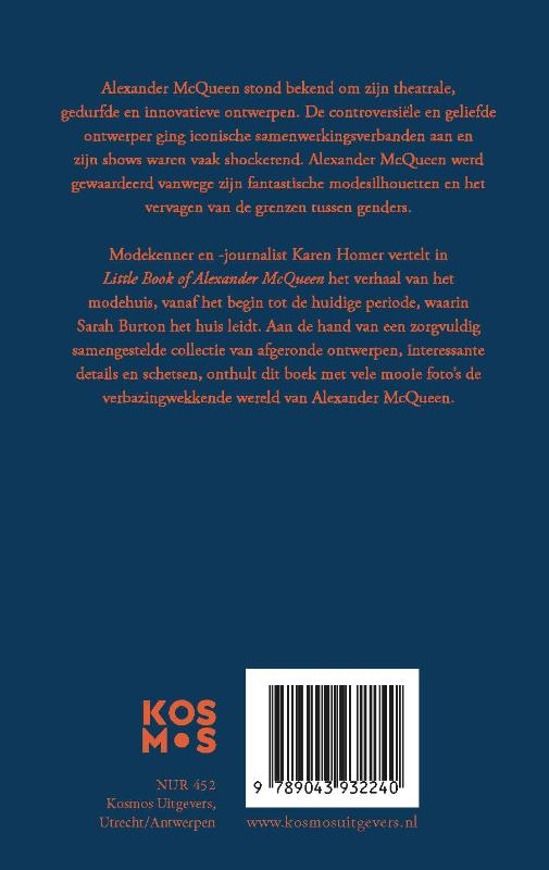 Modekenner en -journalist Karen Homer vertelt in ‘Little Book of Alexander McQueen’ het verhaal van het modehuis, vanaf het begin tot de huidige periode, waarin Sarah Burton de leiding heeft. Aan de hand van een zorgvuldig samengestelde collectie van afgeronde ontwerpen, interessante details en schetsen, onthult dit boek met vele mooie foto’s de verbazingwekkende wereld van Alexander McQueen.