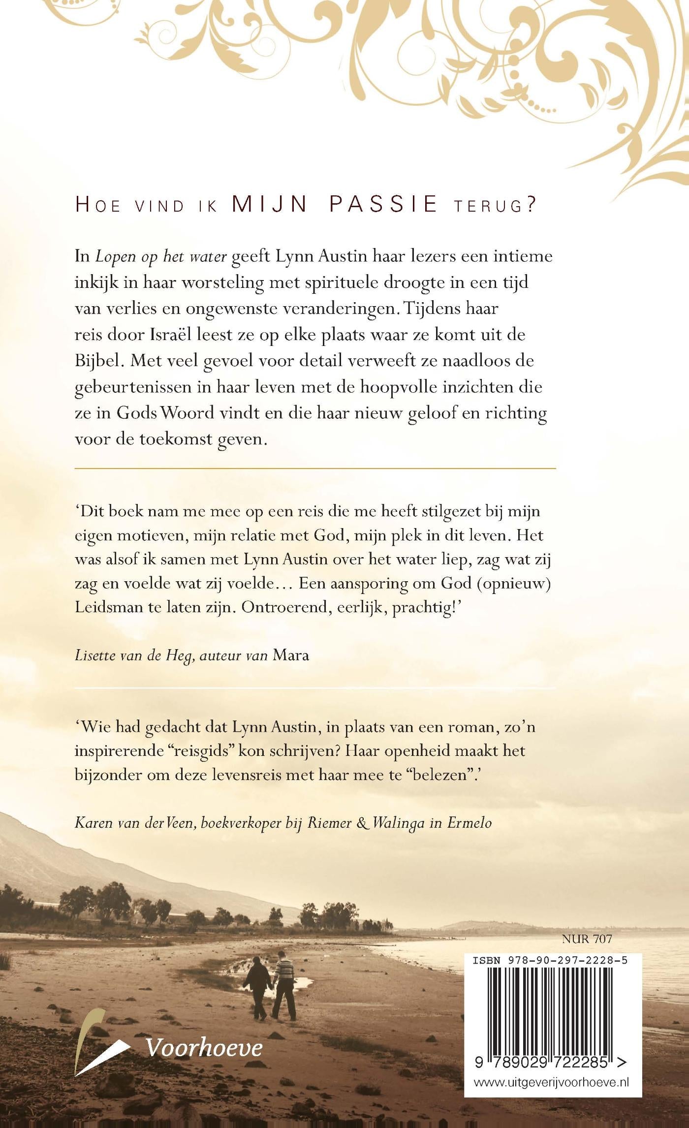 Met een aangrijpende eerlijkheid geeft Lynn Austin met Lopen op het water een intieme kijk in haar eigen worsteling. Hoe krijg ik die passie terug? Ze vertelt over spirituele droogte in een tijd van verlies en ongewenste veranderingen. Tijdens haar pelgrimsreis door Israël leest ze op elke plaats waar ze komt uit de Bijbel. Met veel gevoel voor detail verweeft ze naadloos de gebeurtenissen in haar leven met de hoopvolle inzichten die ze in Gods Woord vindt en die haar nieuw geloof en richting voor de toekomst geven.