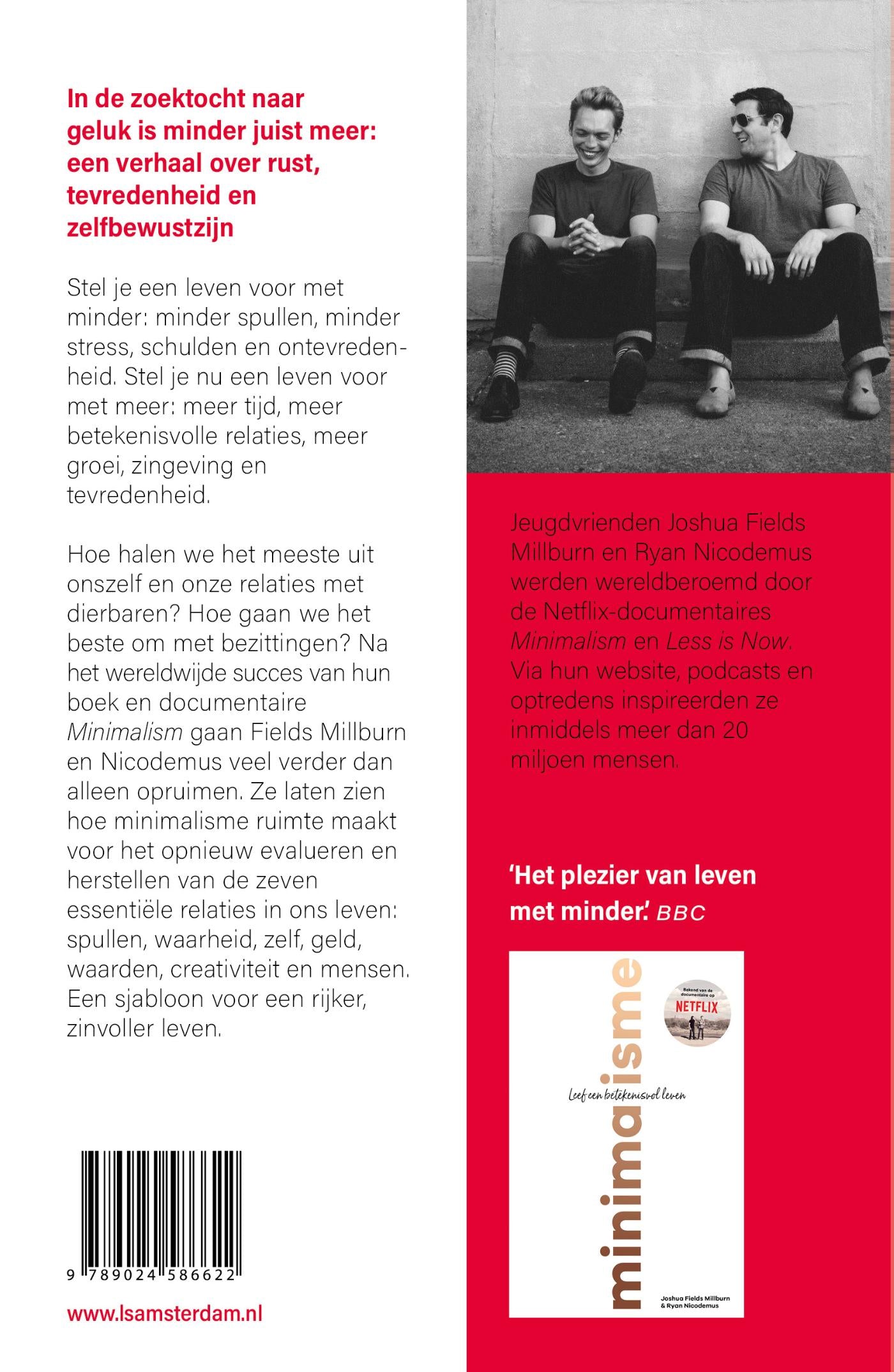 Hoe halen we het meeste uit onszelf en onze relaties met dierbaren? Hoe gaan we het beste om met bezittingen? Na het wereldwijde succes van hun boek en documentaire Minimalisme gaan Fields Millburn en Nicodemus veel verder dan alleen opruimen, en laten ze zien hoe minimalisme ruimte maakt zodat we de zeven essentiële relaties in ons leven opnieuw kunnen evalueren en herstellen: spullen, waarheid, zelf, geld, waarden, creativiteit en mensen. Een sjabloon voor een rijker, zinvoller leven.