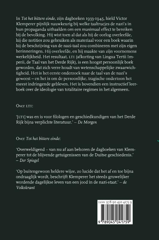 In ‘Tot het bittere einde’, zijn dagboeken 1933-1945, hield Klemperer pijnlijk nauwkeurig bij welk taaltrucjes de nazi's in hun propaganda uithaalden om een maximaal effect te bereiken bij de bevolking. Hij wist toen al dat als hij de oorlog overleefde, hij die notities zou gebruiken als materiaal voor een boek waarin hij de beschrijving van de nazi-taal zou combineren met zijn eigen herinneringen. Hij overleefde, en hij maakte van zijn voornemens werkelijkheid.