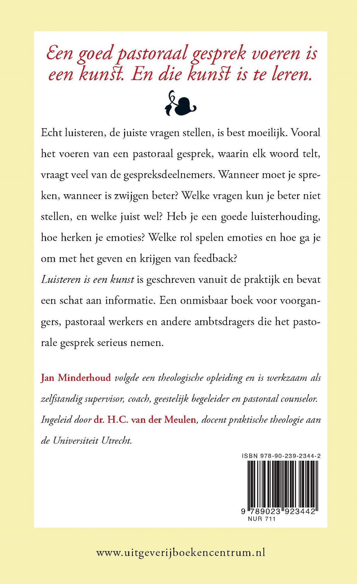 Luisteren is een kunst van Jan Minderhoud is een praktisch boek over het voeren van pastorale gesprekken. Echt luisteren, de juiste vragen stellen, is best moeilijk. Vooral het voeren van een pastoraal gesprek, waarin elk woord telt, vraagt veel van de gespreksdeelnemers. Wanneer moet je spreken, wanneer is zwijgen beter? Welke vragen kun je beter niet stellen, en welke juist wel? Heb je een goede luisterhouding, hoe herken je emoties? Welke rol spelen emoties en hoe ga je om met het geven en krijgen van feedback? Luisteren is een kunst is geschreven vanuit de praktijk en bevat een schat aan informatie. Een onmisbaar boek voor voorgangers, pastoraal werkers en andere ambtsdragers die het pastorale gesprek serieus nemen.