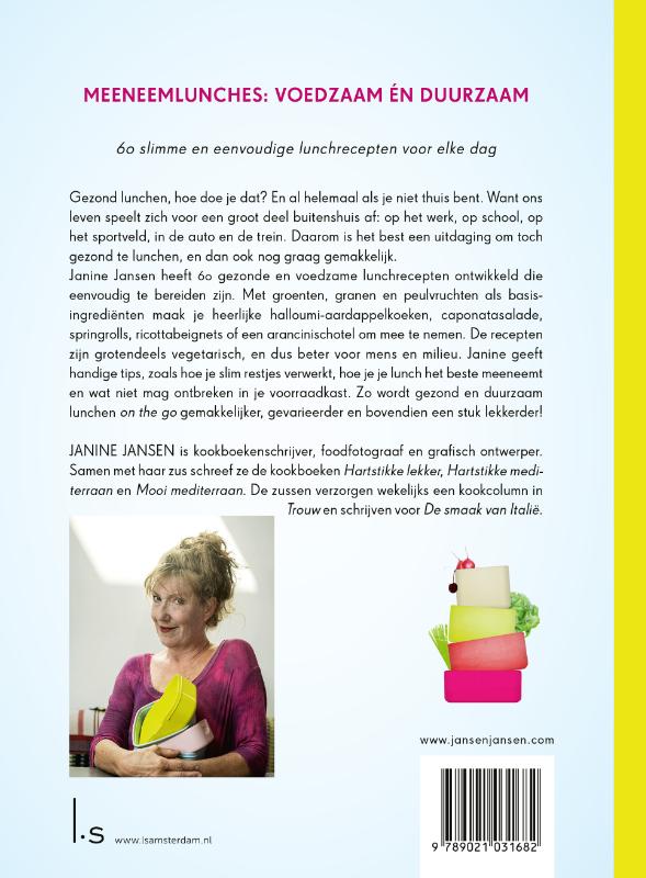 In dit boek vind je 60 verrassende gerechten om mee te nemen naar kantoor, school en voor onderweg. De recepten zijn veelal op basis van granen, groenten en peulvruchten én zijn allemaal vegetarisch, dus beter voor mens en milieu. Janine geeft je handige tips over het slim verwerken van je restjes, hoe je je lunch handig meeneemt en wat er niet mag ontbreken in je voorraadkast. Ook geeft ze suggesties voor de kinderbroodtrommel en bevat het boek een handige maaltijdplanner. Zo wordt gezond en duurzaam lunchen on the go een stuk gemakkelijker!