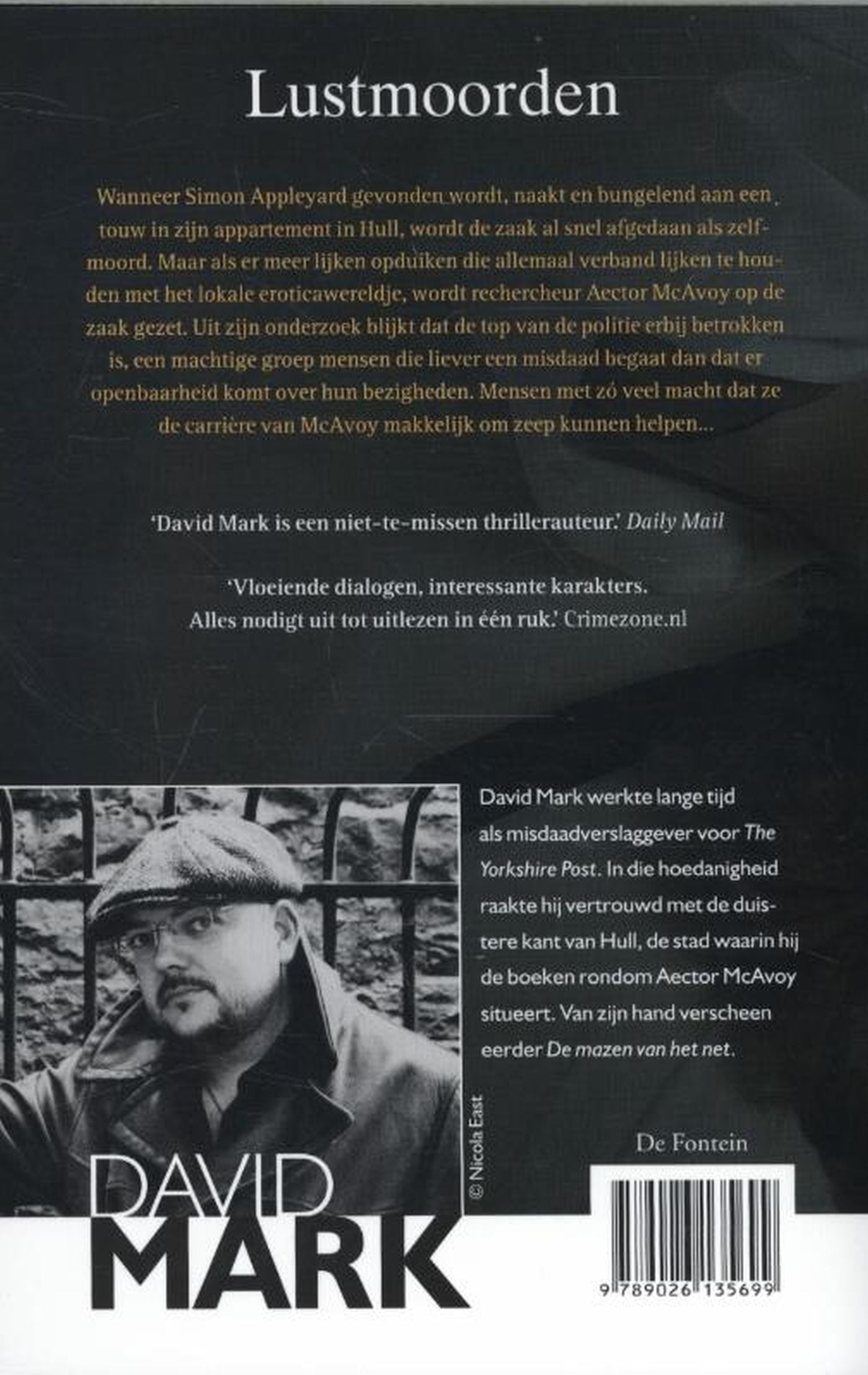 David Mark is de auteur van de thriller `De mazen van het net. Ook `Lustmoorden speelt zich af in Hull. Wanneer Simon Appleyard gevonden wordt, naakt en bungelend aan een touw in zijn appartement in Hull, wordt de zaak al snel afgedaan als een zelfmoord. Maar als er meer lijken opduiken die allemaal verband lijken te houden met het lokale eroticawereldje, wordt rechercheur Aector McAvoy op de zaak gezet. Uit zijn onderzoek blijkt dat de top van de politie erbij betrokken is, een machtige groep mensen die liever een misdaad begaat dan dat er openbaarheid komt over hun bezigheden. Mensen met zóveel macht dat ze de carrière van McAvoy makkelijk om zeep kunnen helpen Val McDermid is fan van David Mark: `een niet te missen thrillerauteur!. 'Heel Brits. Heel spannend.' -LINDA.