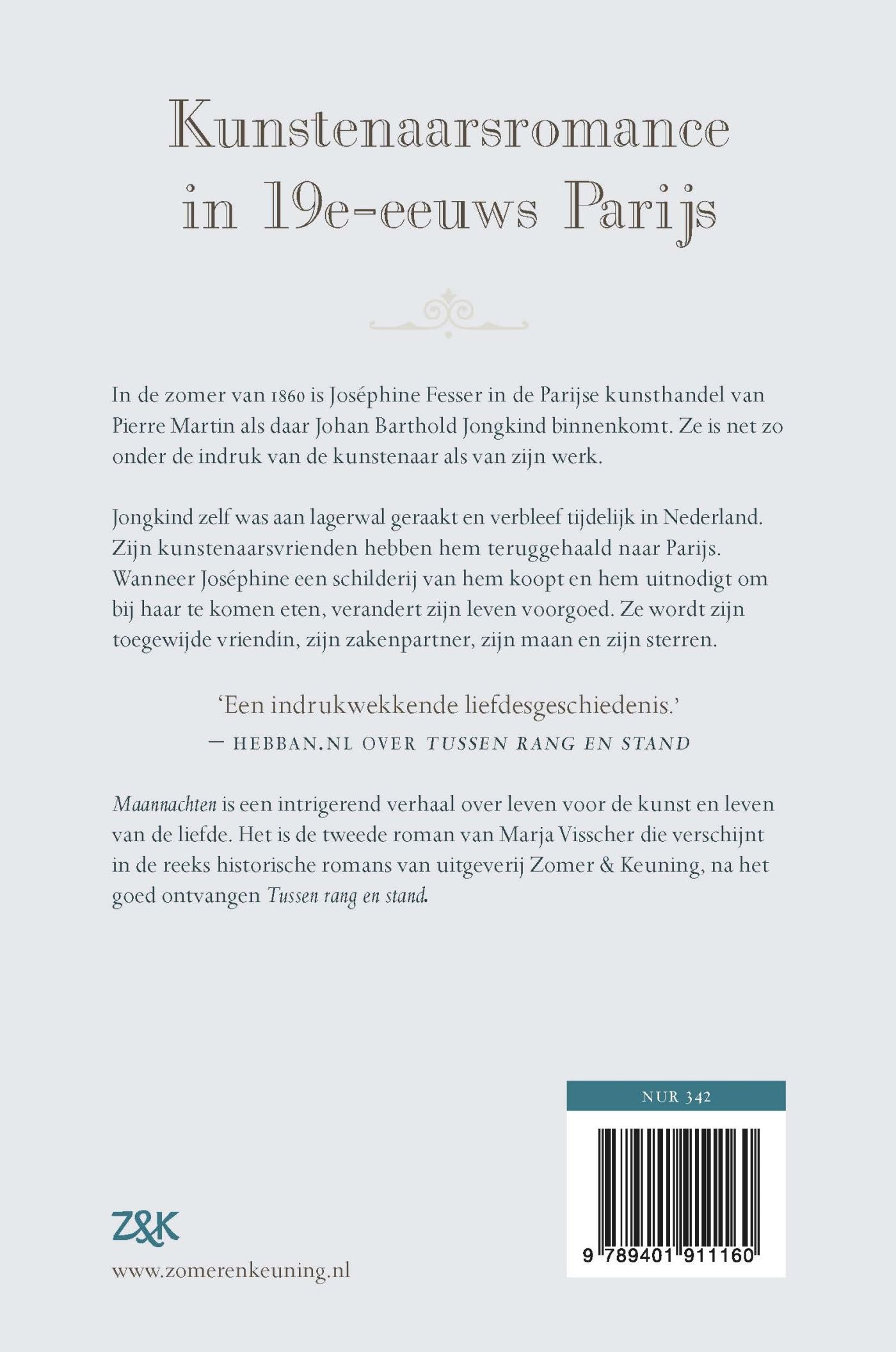 Maannachten’ van Marja Visscher neemt je vanuit het perspectief van Joséphine Fesser mee in het leven van de schilder Johan Barthold Jongkind (1819-1891), voor wie zij al bij hun eerste ontmoeting een grote bewondering opvat. Jongkind was aan lagerwal geraakt en verbleef daarom tijdelijk in Nederland, maar zijn kunstenaarsvrienden hebben hem teruggehaald naar Parijs. Joséphine koopt een schilderij van hem en nodigt hem uit om bij haar te komen eten. Vanaf dat moment wijkt hij nauwelijks nog van haar zijde. ‘Maannachten’ is een intrigerend verhaal over leven voor de kunst en leven van de liefde