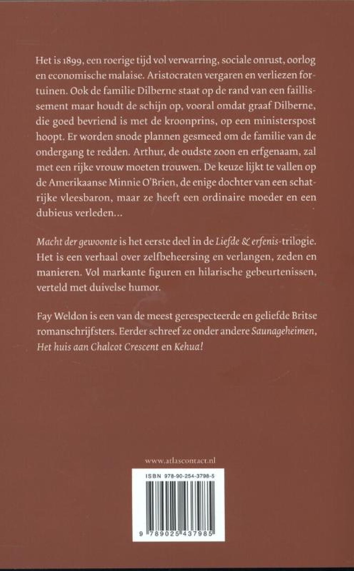 Het is 1899, een roerige tijd vol verwarring, sociale onrust, oorlog en economische malaise. Aristocraten vergaren en verliezen fortuinen. Ook de familie Dilberne staat op de rand van een faillissement maar houdt de schijn op, vooral omdat graaf Dilberne, die goed bevriend is met de kroonprins, op een ministerspost hoopt. Er worden snode plannen gesmeed om de familie van de ondergang te redden. Arthur, de oudste zoon en erfgenaam, zal met een rijke vrouw moeten trouwen. De keuze lijkt te vallen op de Amerikaanse Minnie OBrien, de enige dochter van een schatrijke vleesbaron, maar ze heeft een ordinaire moeder en een dubieus verleden 'Macht der gewoonte' is het eerste deel in de Liefde & erfenis-trilogie. Het is een verhaal over zelfbeheersing en verlangen, zeden en manieren. Vol markante figuren en hilarische gebeurtenissen, verteld met duivelse humor. Fay Weldon is een van de meest gerespecteerde en geliefde Britse romanschrijfsters. Eerder schreef ze onder andere Saunageheimen, Het huis aan Chalcot Crescent en Kehua!