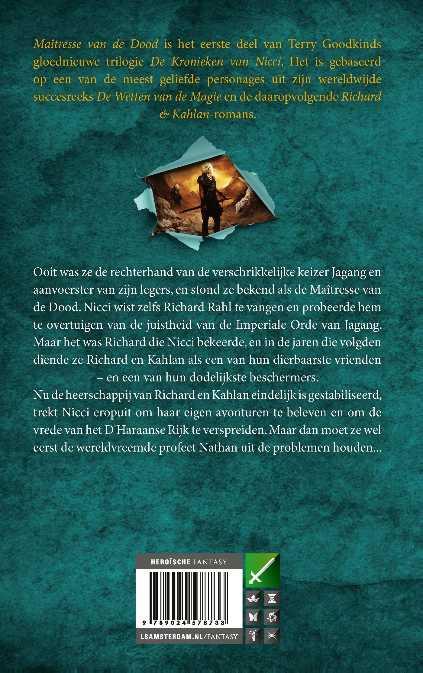 Maîtresse van de Dood is het eerste deel van Terry Goodkinds gloednieuwe trilogie De Kronieken van Nicci. Het is gebaseerd op een van de meest geliefde personages uit zijn wereldwijde succesreeks De Wetten van de Magie, en de daaropvolgende Richard & Kahlan-romans.