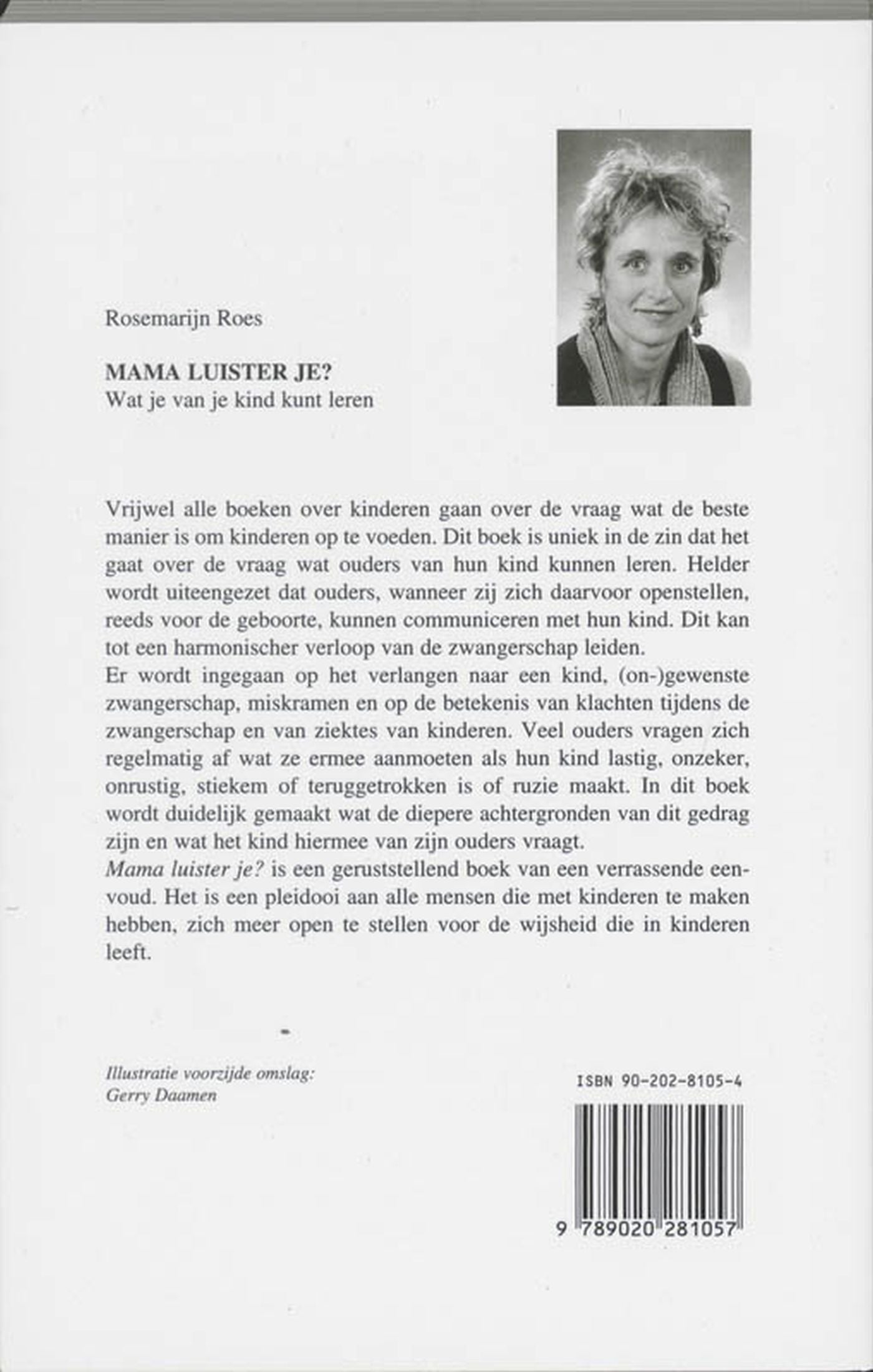 Vrijwel alle boeken over kinderen gaan over de vraag wat de beste manier is om kinderen op te voeden. Dit boek is uniek in de zin dat het gaat over de vraag wat ouders van hun kind kunnen leren. Helder wordt uiteengezet dat ouders, wanneer zij zich daarvoor openstellen, reeds voor de geboorte, kunnen communiceren met hun kind. Dit kan tot een harmonischer verloop van de zwangerschap leiden. Er wordt ingegaan op het verlangen naar een kind, (on)gewenste zwangerschap, miskramen en op de betekenis van klachten tijdens de zwangerschap en van ziektes van kinderen. Veel ouders vragen zich regelmatig af wat ze ermee aanmoeten als hun kind lastig, onzeker, onrustig, stiekem of teruggetrokken is of ruzie maakt. In dit boek wordt duidelijk gemaakt wat de diepere achtergronden van dit gedrag zijn en wat het kind hiermee van zijn ouders vraagt. Mama luister je? Is een geruststellend boek van een verrassende eenvoud. Het is een pleidooi aan alle mensen die met kinderen te maken hebben, zich meer open te stellen voor de wijsheid die in kinderen leeft.