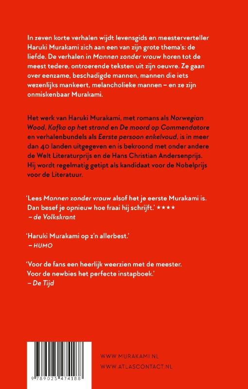 In ‘Mannen zonder vrouw’ wijdt meesterverteller Haruki Murakami zich aan een van zijn grote thema’s: de liefde. De zeven korte verhalen in deze bundel horen tot de meest tedere, ontroerende teksten uit zijn oeuvre – en ze zijn onmiskenbaar Murakami. Over eenzame, beschadigde mannen, mannen die iets wezenlijks mankeren, melancholieke mannen. Met andere woorden: kleurloze mannen… Verdwijnende katten en rokerige cafes, eenzame harten en mysterieuze vrouwen, honkbal en de Beatles worden tot aansprekende verhalen gesmeed die iedereen zullen aanspreken.