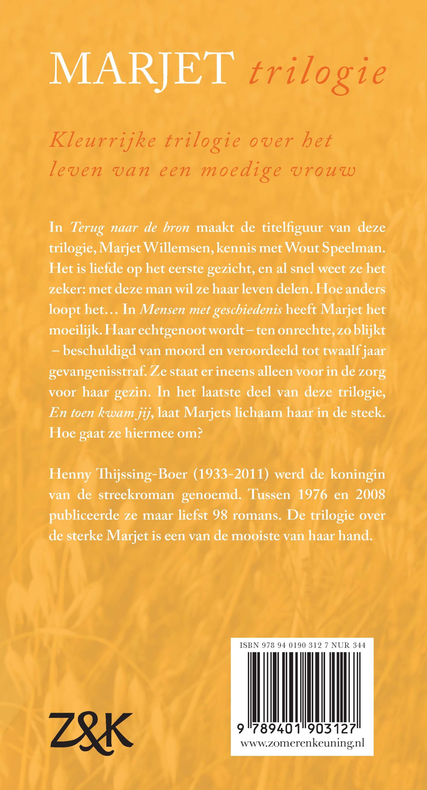 De ‘Marjet trilogie’ van Henny Thijssing-Boer is een kleurrijke trilogie over het leven van een dappere vrouw. Deze e-bookbundel bevat ‘Terug naar de bron’, ‘Mensen met geschiedenis’ en ’En toen kwam jij’. Heerlijke ontspanning in drie vervolgdelen van de schrijfster die de ‘koningin van de streekroman’ als eretitel kreeg.