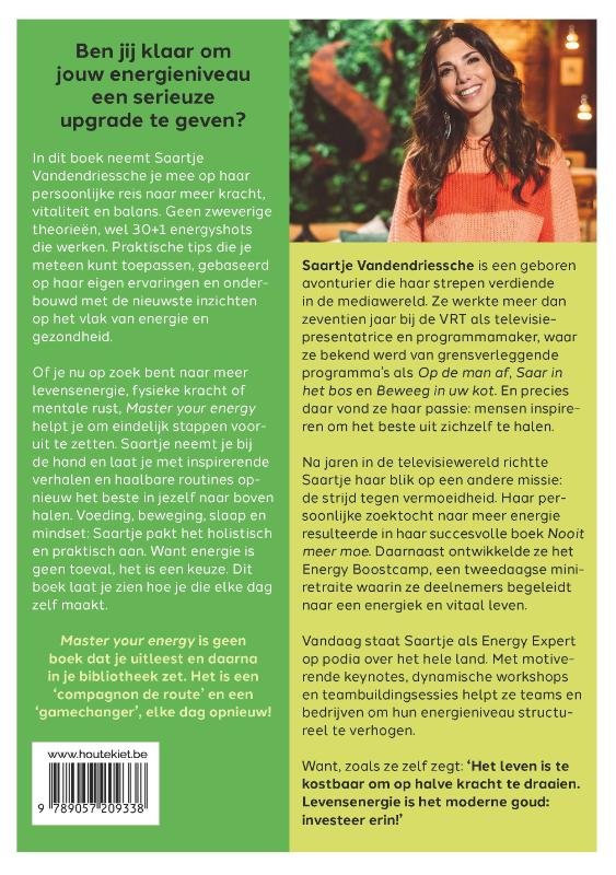 Of je nu op zoek bent naar meer lichamelijke energie, fysieke kracht of mentale rust, Master your energy helpt je om eindelijk stappen vooruit te zetten. Saartje neemt je bij de hand en laat je met inspirerende verhalen en haalbare routines opnieuw het beste in jezelf naar boven halen. Voeding, beweging, slaap en mindset: Saartje pakt het holistisch en praktisch aan. Want energie is geen toeval, het is een keuze. En dit boek laat je zien hoe je die elke dag zelf maakt.
