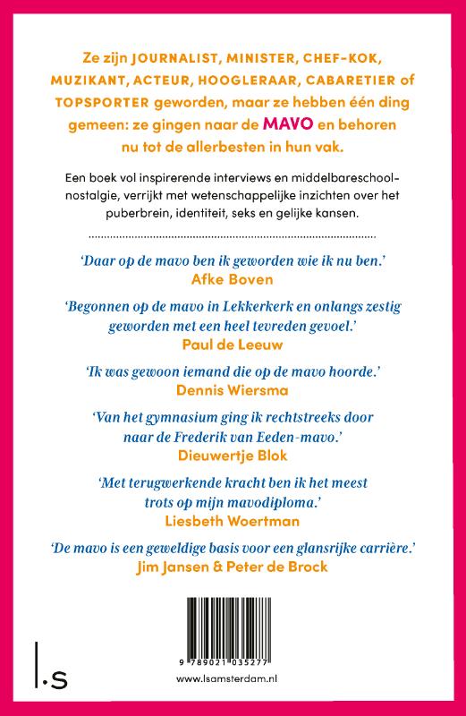 Ze zijn minister, schrijver, burgemeester, actrice, cabaretier of topsporter geworden en hebben één ding gemeen: ze gingen naar de mavo en behoren nu tot de allerbesten van hun vak. In 21 inspirerende interviews, inclusief portret én een oude schoolfoto, kijken Youp van ’t Hek, Bettine Vriesekoop, Cisca Wijmenga, Jochem van Gelder, Cindy Hoetmer en vele anderen terug en delen wat ze hebben geleerd van deze meest vormende periode in hun leven.