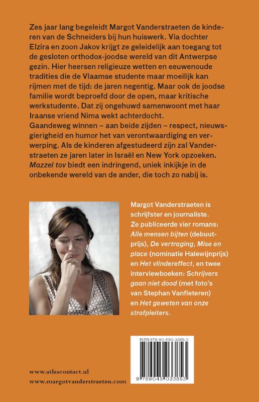 ‘Mazzel tov’ biedt een indringend, uniek inkijkje in de onbekende wereld van een gesloten orthodox-joods gezin in Antwerpen. Zes jaar lang begeleidt auteur Margot Vanderstraeten de kinderen van de familie Schneider bij hun huiswerk. Via dochter Elzira en zoon Jakov krijgt ze geleidelijk aan toegang tot hun wereld. Hier heersen religieuze wetten en eeuwenoude tradities die de Vlaamse studente maar moeilijk kan rijmen met de tijd: de jaren negentig. Maar ook de joodse familie wordt beproefd door de open, maar kritische werkstudente. Dat zij ongehuwd samenwoont met haar Iraanse vriend Nima wekt achterdocht. Gaandeweg winnen – aan beide zijden – respect, nieuwsgierigheid en humor het van verontwaardiging en verwerping. Als de kinderen afgestudeerd zijn zal Vanderstraeten ze jaren later in Israël en New York opzoeken.