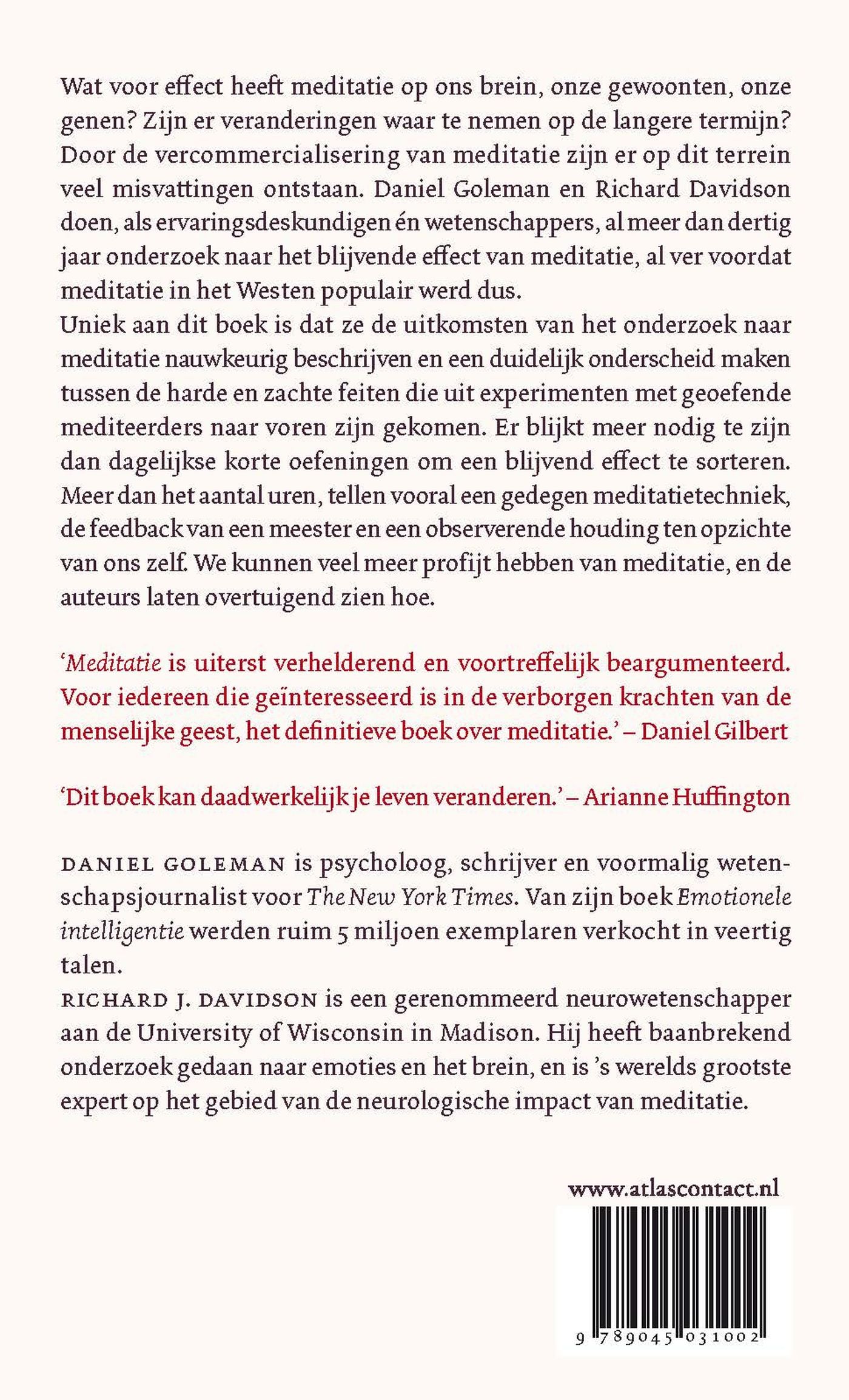 Uniek aan dit boek is dat Goleman en Davidson de uitkomsten van het onderzoek naar meditatie nauwkeurig beschrijven en een duidelijk onderscheid maken tussen de harde en zachte feiten die uit experimenten met geoefende mediteerders naar voren zijn gekomen. Er blijkt meer nodig te zijn dan dagelijkse korte oefeningen om een blijvend effect te sorteren. Meer dan het aantal uren, tellen vooral een gedegen meditatietechniek, de feedback van een meester en een observerende houding ten opzichte van ons zelf. We kunnen veel meer profijt hebben van meditatie, en de auteurs laten overtuigend zien hoe.