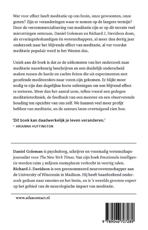 Uniek aan dit boek is dat Goleman en Davidson de uitkomsten van het onderzoek naar meditatie nauwkeurig beschrijven en een duidelijk onderscheid maken tussen de harde en zachte feiten die uit experimenten met geoefende mediteerders naar voren zijn gekomen. Er blijkt meer nodig te zijn dan dagelijkse korte oefeningen om een blijvend effect te sorteren. Meer dan het aantal uren, tellen vooral een gedegen meditatietechniek, de feedback van een meester en een observerende houding ten opzichte van ons zelf. We kunnen veel meer profijt hebben van meditatie, en de auteurs laten overtuigend zien hoe.