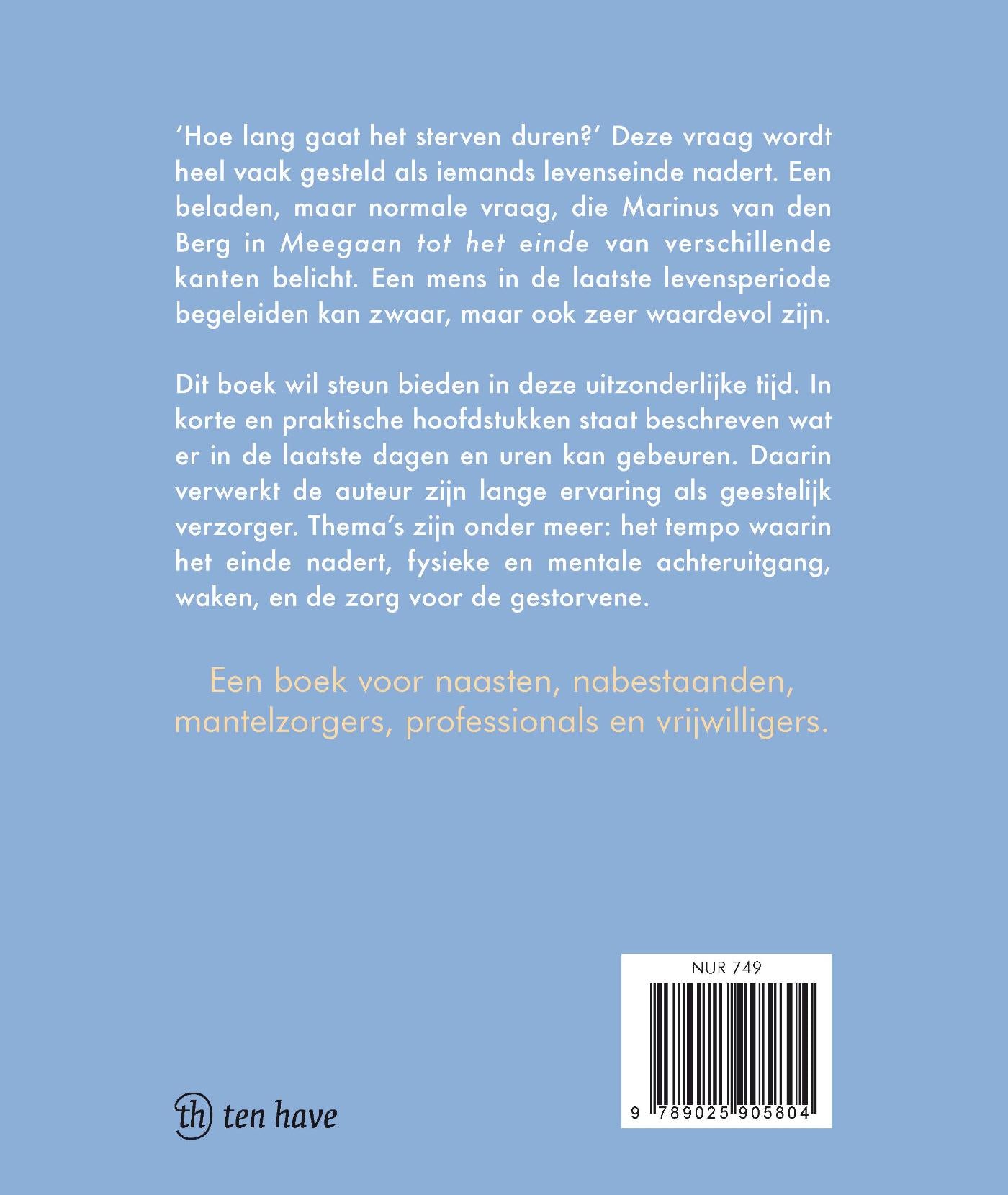 In 'Meegaan tot het einde' biedt Marinus van den Berg inzicht in de laatste, maar zeer kostbare tijd van een stervende. 'Hoe lang duurt het nog?' Deze vraag wordt heel vaak gesteld als iemands ziekbed sterfbed wordt. Een mens in de laatste periode van zijn leven begeleiden kan zwaar, maar ook zeer waardevol zijn. In korte, vaak praktische hoofdstukken beschrijft Van den Berg wat er kan gebeuren. Thema's zijn onder meer het tempo waarin het einde nadert, fysieke en mentale achteruitgang, waken, en de zorg voor de gestorvene. Een boek voor familieleden, mantelzorgers en hulpverleners.