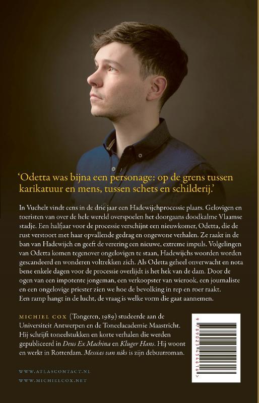 In ‘Messias van niks’ van Michiel Cox hangt een ramp in de lucht, en de vraag is welke vorm die gaat aannemen. In Vuchelt vindt eens in de drie jaar een Hadewijchprocessie plaats. Gelovigen en toeristen van over de hele wereld overspoelen het doorgaans doodkalme Vlaamse stadje. Een halfjaar voor de processie verschijnt een nieuwkomer, Odetta, die de rust verstoort met haar opvallende gedrag en ongewone verhalen. Ze raakt in de ban van Hadewijch en geeft de verering een nieuwe, extreme impuls. Volgelingen van Odetta komen tegenover ongelovigen te staan, Hadewijchs woorden worden gescandeerd en wonderen voltrekken zich. Als Odetta geheel onverwacht en nota bene enkele dagen voor de processie overlijdt is het hek van de dam. Door de ogen van een impotente jongeman, een verkoopster van wierook, een journaliste en een ongelovige priester zien we hoe de bevolking in rep en roer raakt.