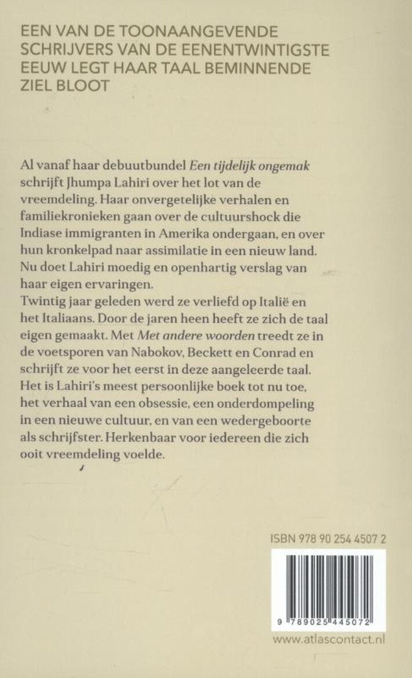 Twintig jaar geleden werd ze verliefd op Italië en het Italiaans. Door de jaren heen heeft ze zich de taal eigen gemaakt. Met 'Met andere woorden' treedt ze in de voetsporen van Nabokov, Beckett en Conrad en schrijft ze voor het eerst in deze aangeleerde taal. Het is Lahiri’s meest persoonlijke boek tot nu toe, het verhaal van een obsessie, een onderdompeling in een nieuwe cultuur, en van een wedergeboorte als schrijfster. Herkenbaar voor iedereen die zich ooit vreemdeling voelde.
