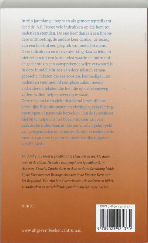 In zijn jarenlange loopbaan als gemeentepredikant deed ds. A.F. Troost vele indrukken op die hem tot nadenken stemden. De ene keer dankzij een bijzondere ontmoeting, de andere keer dankzij de lezing van een boek of een gesprek van mens tot mens. Deze indrukken en de overdenking daarna leidden niet zelden tot een korte tekst waarin de indruk of de gedachte op een aansprekende wijze verwoord is.