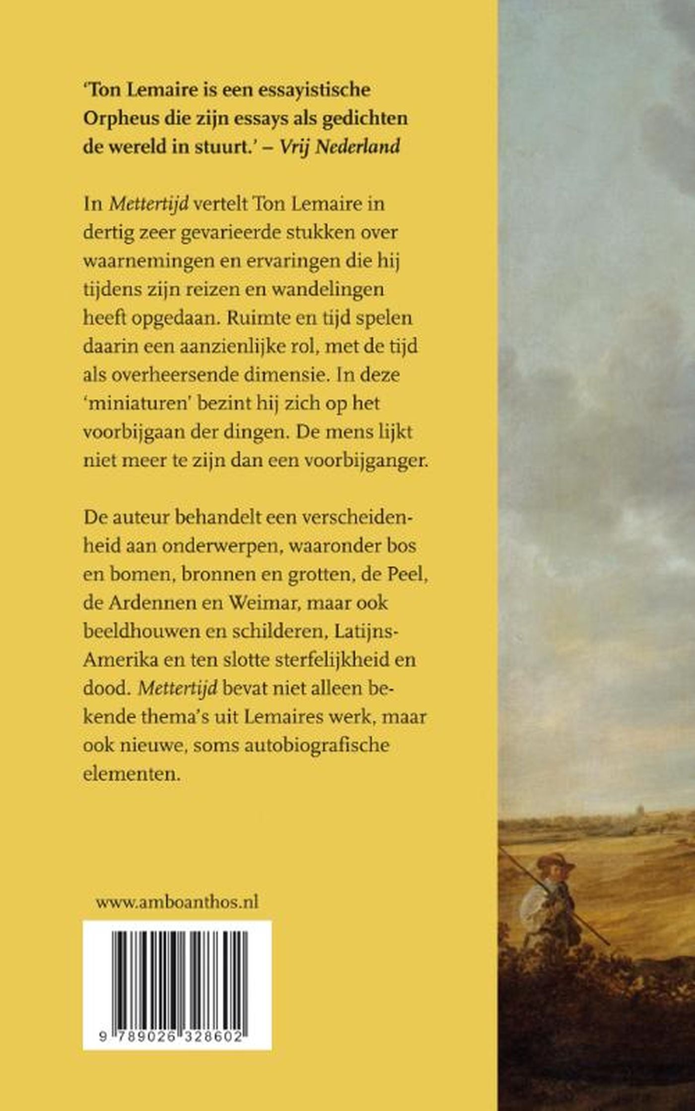 Antropoloog en filosoof Ton Lemaire is bekend van zijn boeken 'Filosofie van het landschap', 'De val van Prometheus ' en 'Verre velden'. In zijn nieuwe boek `Mettertijd staan dertig zeer gevarieerde stukken met daarin waarnemingen en ervaringen die Lemaire tijdens zijn reizen en wandelingen heeft opgedaan. Ruimte en tijd spelen daarin een aanzienlijke rol, met de tijd wel als overheersende dimensie. Deze `miniaturen bezinnen zich op het voorbijgaan der dingen en over onszelf als `voorbijgangers .