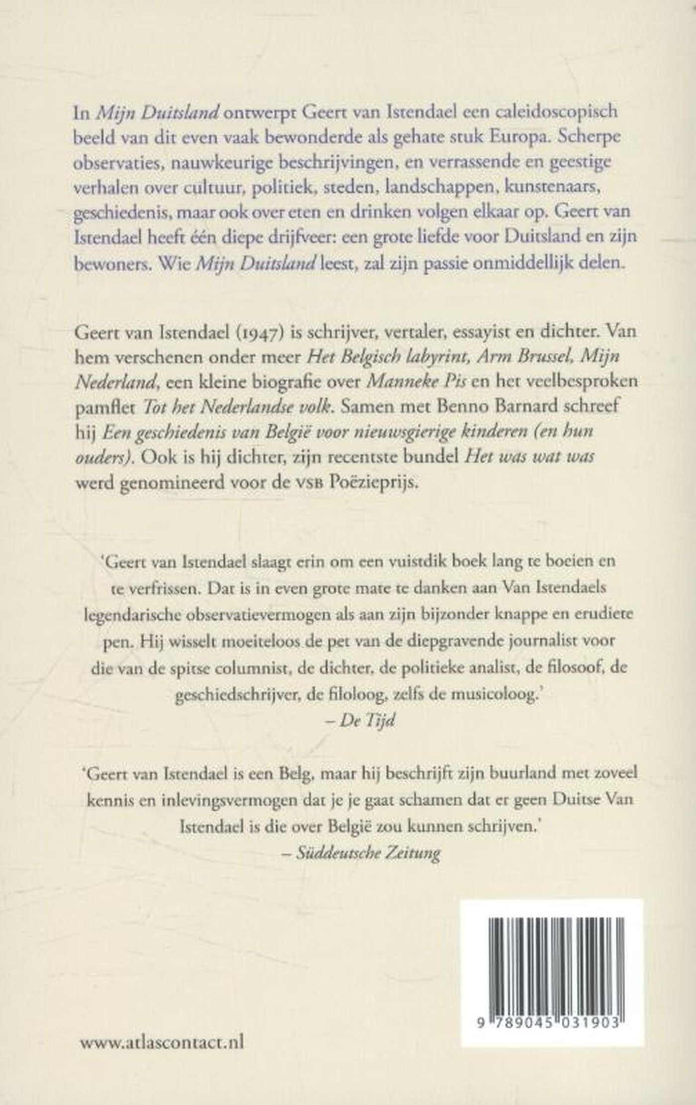 In Mijn Duitsland ontwerpt Geert van Istendael een caleidoscopisch beeld van dit even vaak bewonderde als gehate stuk Europa. Scherpe observaties, nauwkeurige beschrijvingen, en verrassende en geestige verhalen over cultuur, politiek, steden, landschappen, kunstenaars, geschiedenis, maar ook over eten en drinken volgen elkaar op. Geert van Istendael heeft één diepe drijfveer: een grote liefde voor Duitsland en zijn bewoners. Wie Mijn Duitsland leest, zal zijn passie onmiddellijk delen. Geert van Istendael (1947) is schrijver, essayist en dichter. Hij publiceerde eerder in deze reeks Mijn Nederland. Mijn Nederland is een boek vol sprankelende miniatuurtjes, geschilderd met het fijnste penseel, zoals alleen een Vlaamse meester dat kan. Geert Mak Heerlijke observaties. Trouw Zijn liefdesverklaring heeft me in een uitgesproken on-Hollands, zonnig humeur gebracht. Vooral door de vrolijke taal die hij bezigt: een wulpse, fraai geciseleerde vorm van Vlaamse barok. HP/de Tijd