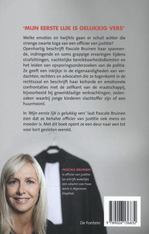 'Mijn eerste lijk is gelukkig vers' biedt een uniek kijkje achter de schermen van de misdaadbestrijding. Pascale Bruinen is officier van justitie en schrijft een wekelijkse column over haar werk in Algemeen Dagblad. Welke gevoelens, emoties en twijfels gaan er schuil achter die strenge zwarte toga van de officier van justitie? Met een open en eerlijke blik beschrijft Pascale Bruinen haar spannende, grappige en vaak indringende ervaringen tijdens strafzittingen, nachtelijke diensten en het leiden van opsporingsonderzoeken van de politie. In 'Mijn eerste lijk is gelukkig vers' laat zij zien dat ze als officier van justitie dan wel `één en ondeelbaar is maar dat ze als persoon en auteur juist de som van drie delen is: magistraat, mens en moeder. Met dit boek opent ze een deur naar een wereld die tot voor kort hermetisch gesloten bleef.