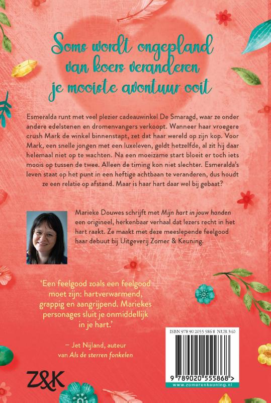 'Mijn hart in jouw handen' van Marieke Douwes vertelt het verhaal van Esmeralda. Zij runt met veel plezier cadeauwinkel De Smaragd, waar ze onder andere edelstenen en dromenvangers verkoopt. Wanneer haar vroegere crush, Mark, haar winkel binnenstapt zet dat haar wereld op zijn kop.