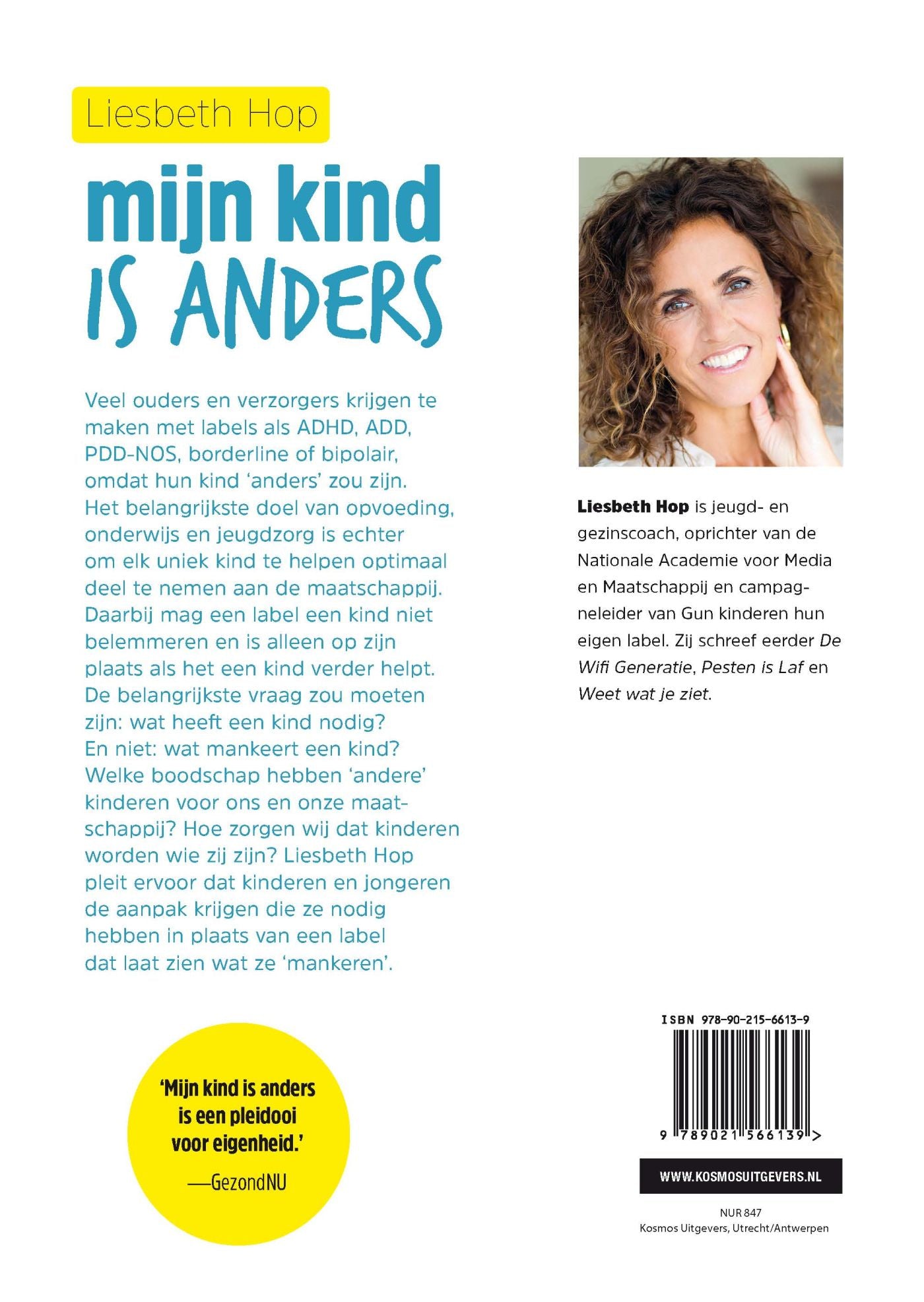 Mijn kind is anders van jeugd- en gezinscoach Liesbeth Hop is het boek voor iedere ouder of verzorger die een kind heeft dat ‘anders’ is door een label als ADHD, ADD, PDD-NOS, borderline of bipolair. Maar elk kind is uniek en hoe weet je nu wat jouw kind nodig heeft? Wanneer laat je testen en wanneer is ‘anders’ een probleem? Dit boek geeft antwoord op belangrijke vragen en laat zien hoe je het kind verder helpt en een label geen beperking wordt. Zo wordt je kind wie het is!