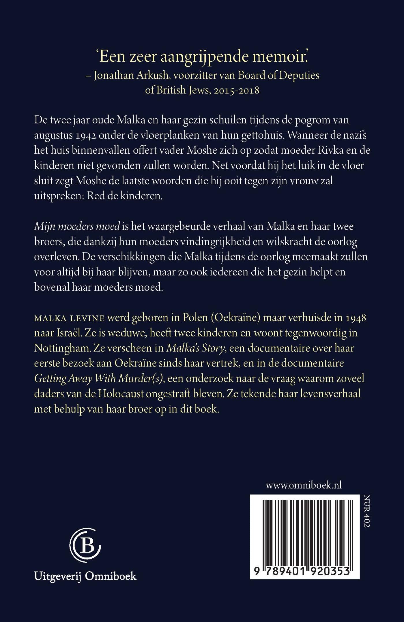 ‘Mijn moeders moed’ is het levensverhaal van Malka Levine. De twee jaar oude Malka en haar gezin schuilen tijdens de pogrom van augustus 1942 onder de vloerplanken van hun gettohuis in Volodymyr-Volynskyi (toen Polen, nu Oekraïne). Wanneer de nazi’s het huis binnenvallen offert vader Moshe zich op zodat moeder Rivka en de kinderen niet gevonden zullen worden. Net voordat hij het luik in de vloer sluit zegt Moshe de laatste woorden die hij ooit tegen zijn vrouw zal uitspreken: Red de kinderen.