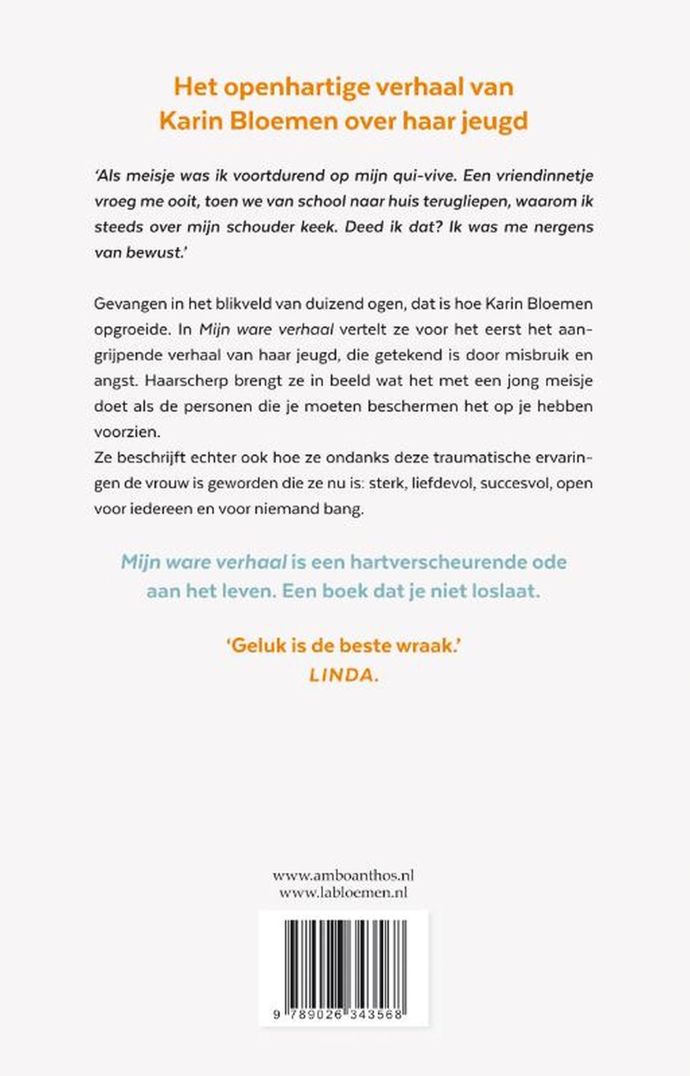 In haar autobiografie Mijn ware verhaal vertelt cabaretière Karin Bloemen voor het eerst het aangrijpende verhaal van haar jeugd, die getekend is door misbruik, mishandeling en angst. Haarscherp brengt ze in beeld wat het met een jong meisje doet als de personen die je moeten beschermen het op je hebben voorzien. Karin Bloemen laat echter ook zien hoe ze ondanks deze traumatische ervaringen de vrouw is geworden die ze nu is: sterk, liefdevol, succesvol, open voor iedereen en voor niemand bang.