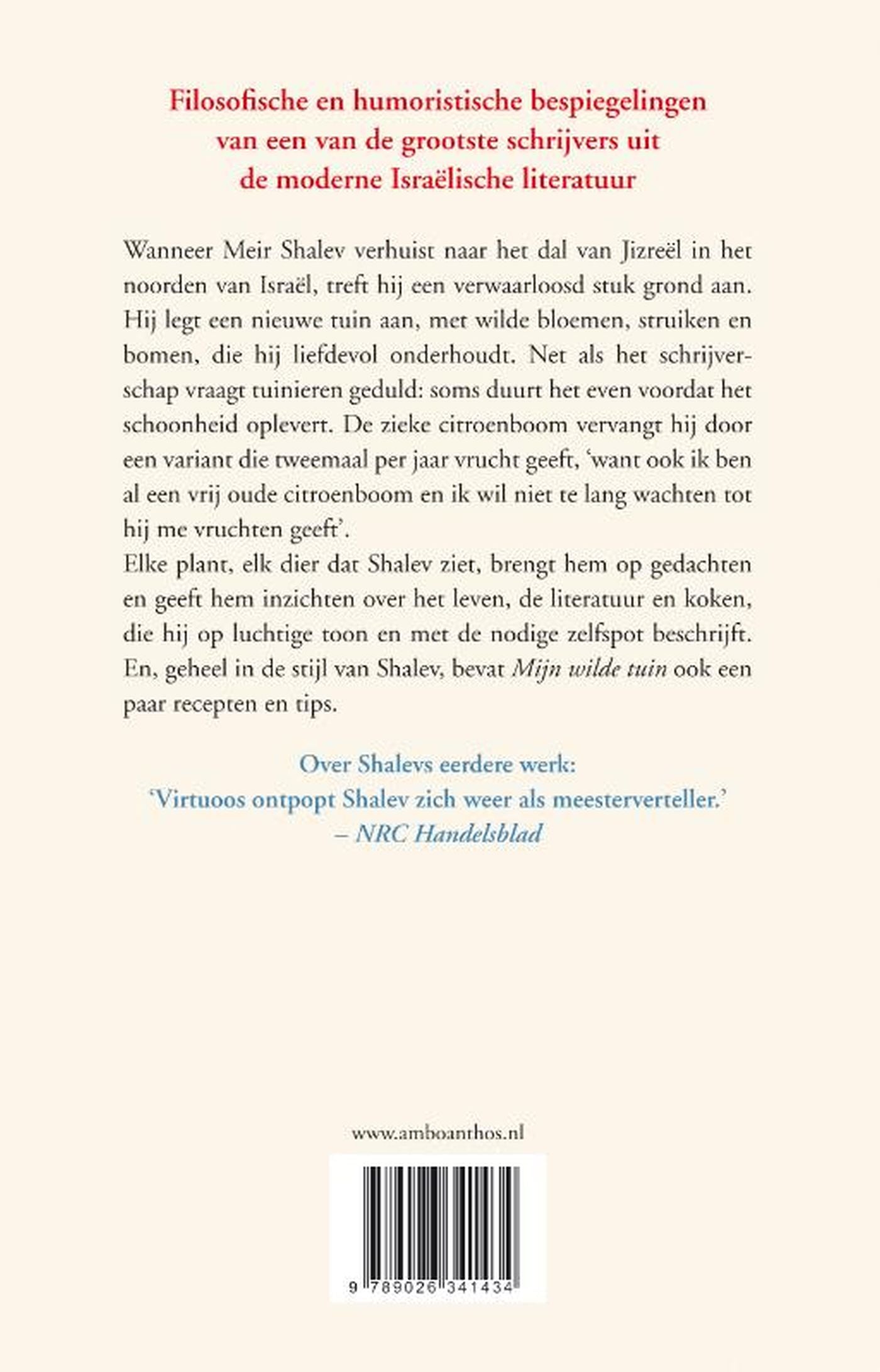 Zelfportret van de grootse Israëlische schrijver Meir Shalev als tuinier, vol levenswijsheid en humor. In ‘Mijn wilde tuin’ beschrijft Meir Shalev zijn verhuizing naar de Vlakte van Jizreel in het noorden van Israël, waar hij een haveloos stuk grond aantreft. Hij legt een nieuwe tuin aan, met wilde bloemen,struiken en bomen, die hij liefdevol onderhoudt. Net als het schrijverschap vraagt tuinieren geduld: soms duurt het even voordat het schoonheid oplevert. Elke plant, elk dier dat Shalev ziet, brengt hem op gedachten en inzichten over het leven, de literatuur en koken. ‘Mijn wilde tuin’ van Meir Shalev bevat filosofische en humoristische bespiegelingen en is gelardeerd met fullcolourillustraties en recepten: een ideaal cadeauboek!